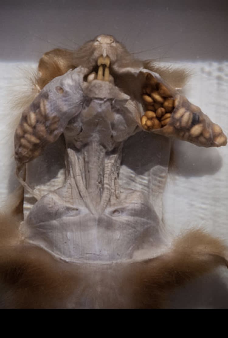 Je savais que t’ étais un fin gourmet. Tiens je suis allé voir le crâne du koala. Il bouffe des feuilles d’Eucalyptus . On pourrait se dire : ça doit être un peu près pareil que le panda. Pas du tout :) effectivement pas de rapport c’est un marsupial. c’est là que j’ai découvert que le koala avait des abajoues, les mêmes qu’on peut trouver sur la Tamia rayé. On peut en stocker de la nourriture :)