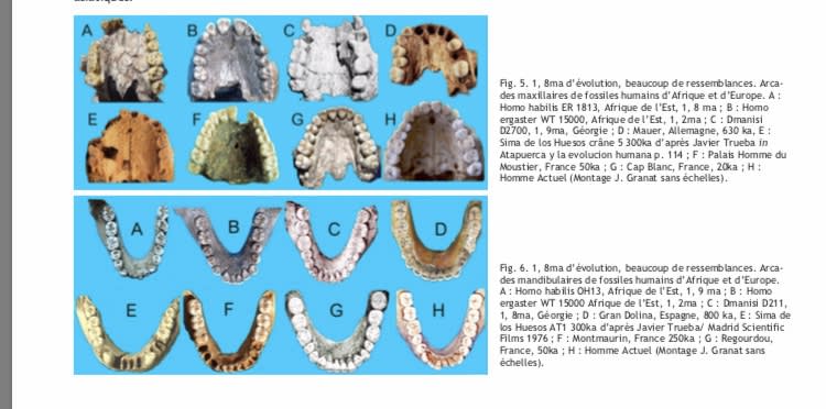 L’homo habilis serait parti d’Afrique pour donner l’homo sapiens en Europe puis l’homo Sapiens sapiens et le Neandertal , ensuite Le sapiens sapiens serait revenu en Afrique pour ensuite repartir d’Afrique et revenir en Europe Asie. Parallèlement l’homo erectus se serait éteint. Ils ont tous quasi la même forme de mâchoire et des dents quasi équivalentes .