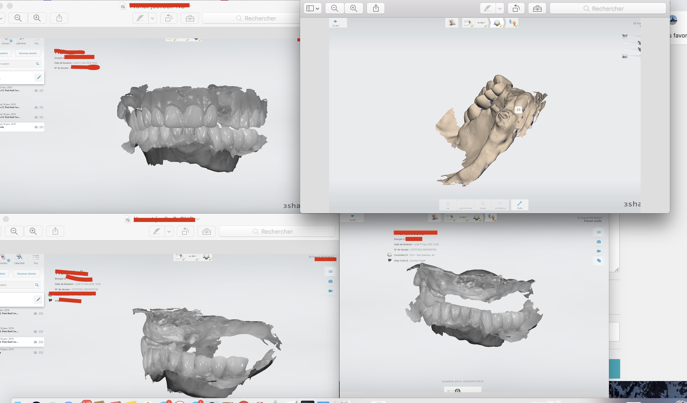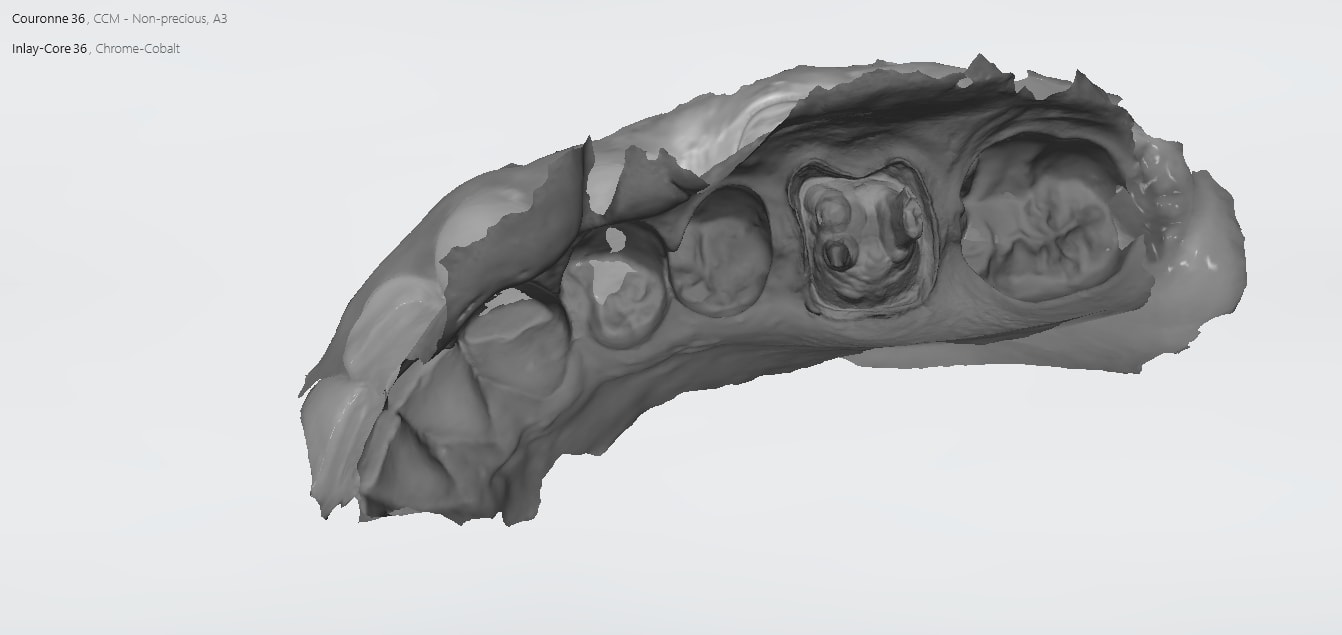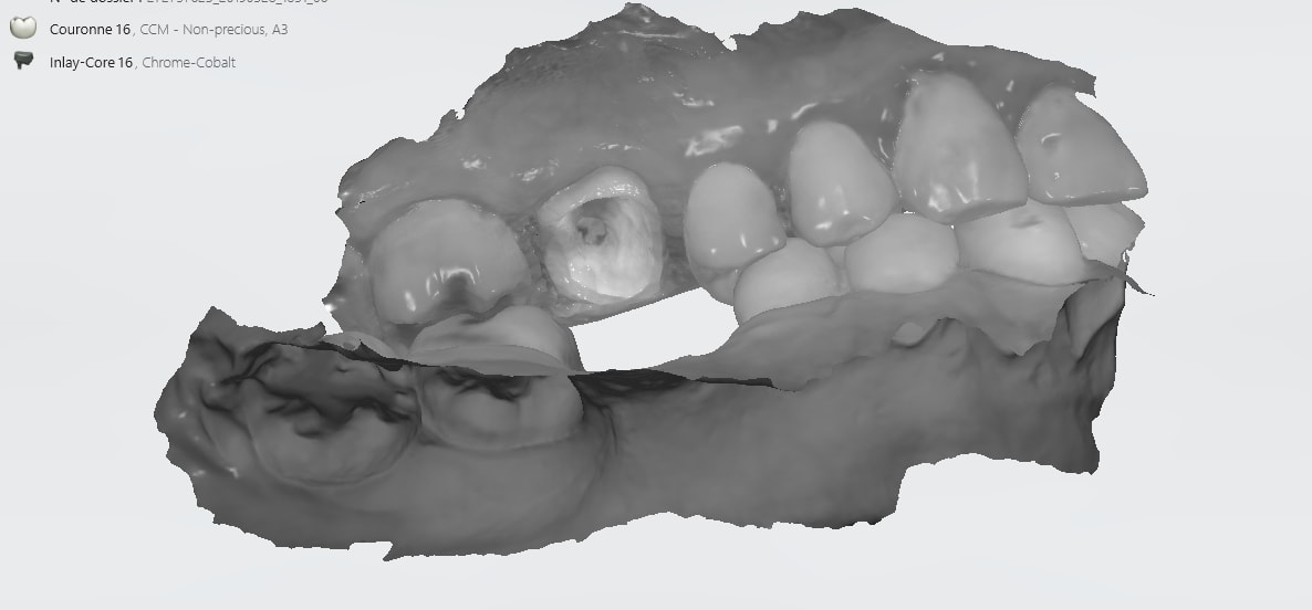 Idem que Chicot: Oneshot mais avec un peu plus d’éléments : 3IC, 8 CCM, 1 Stelitte. Aucune retouche autre qu’occlusale. Même Labo, c’est basique mais efficace
