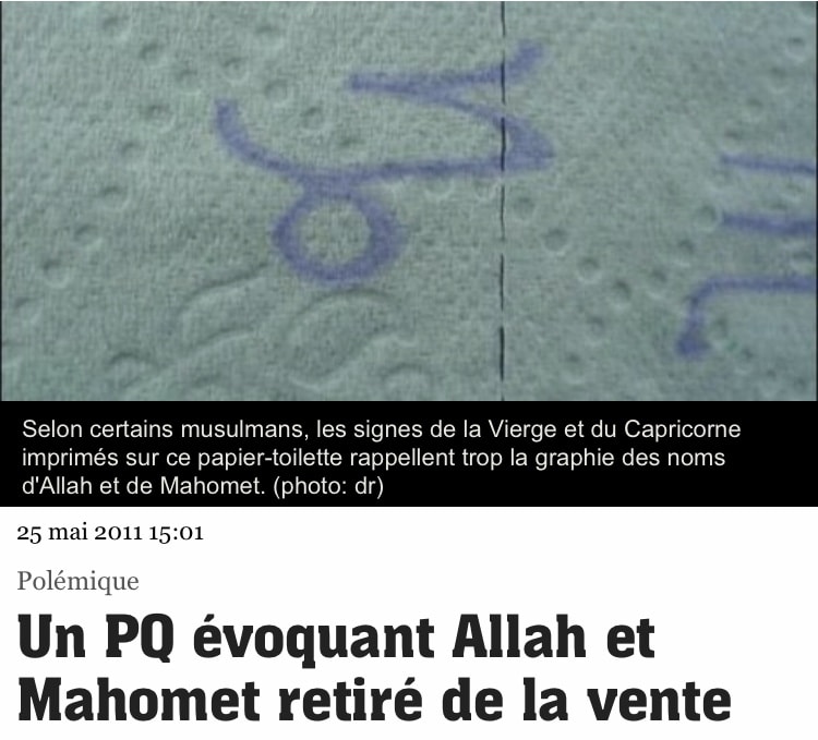 Papier toilette pour toi. Au choix les noms du zodiaque qui sont proches de l’inscription de Mahomet ou PQ avec la bible dessus. Pour prier et bien t’essuyer ensuite.