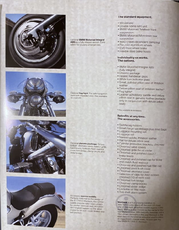 Je suis retombé sur le prospectus de ma fabuleuse ( de fabula, la Légende) BMW R 1200C MONTAUK. Ca remonte à 2004.