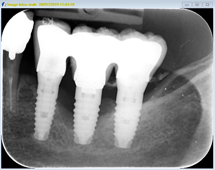 Non, ce sont des particules de métal qui n'ont pas encore été rincées suite à la réalisation de puits d’accès occlusaux pour démontage et explantation de l'implant 36....