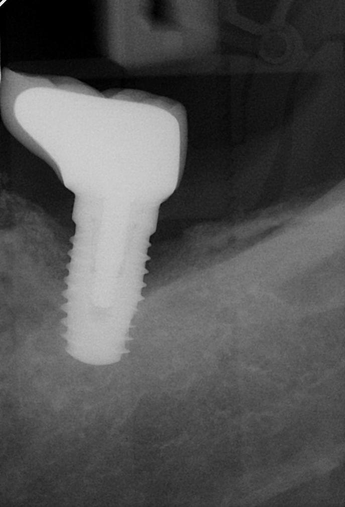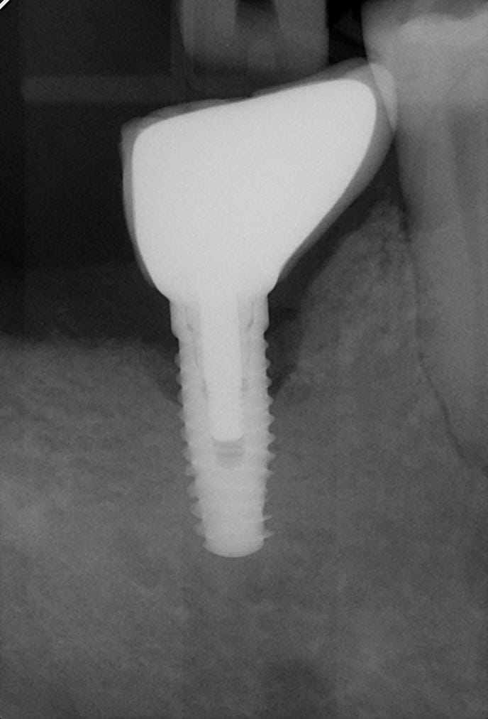 Au passage vous pouvez admirer la perte d’os qui est souvent présente sur ces implants « grandes marques » qui coûtent la peau du cul , avec notamment ce type d’anatomie avec un col large qui n’est pas dans le prolongement du corps de l’implant. Je n’en dirais pas plus c’est du sérieux puisque c’est Une grande marque ....... :) pour peu qu’i y ait un problème de pose, et un garde manger entre l’implant et la dent , et là on est encore plus certain de perdre de l’os