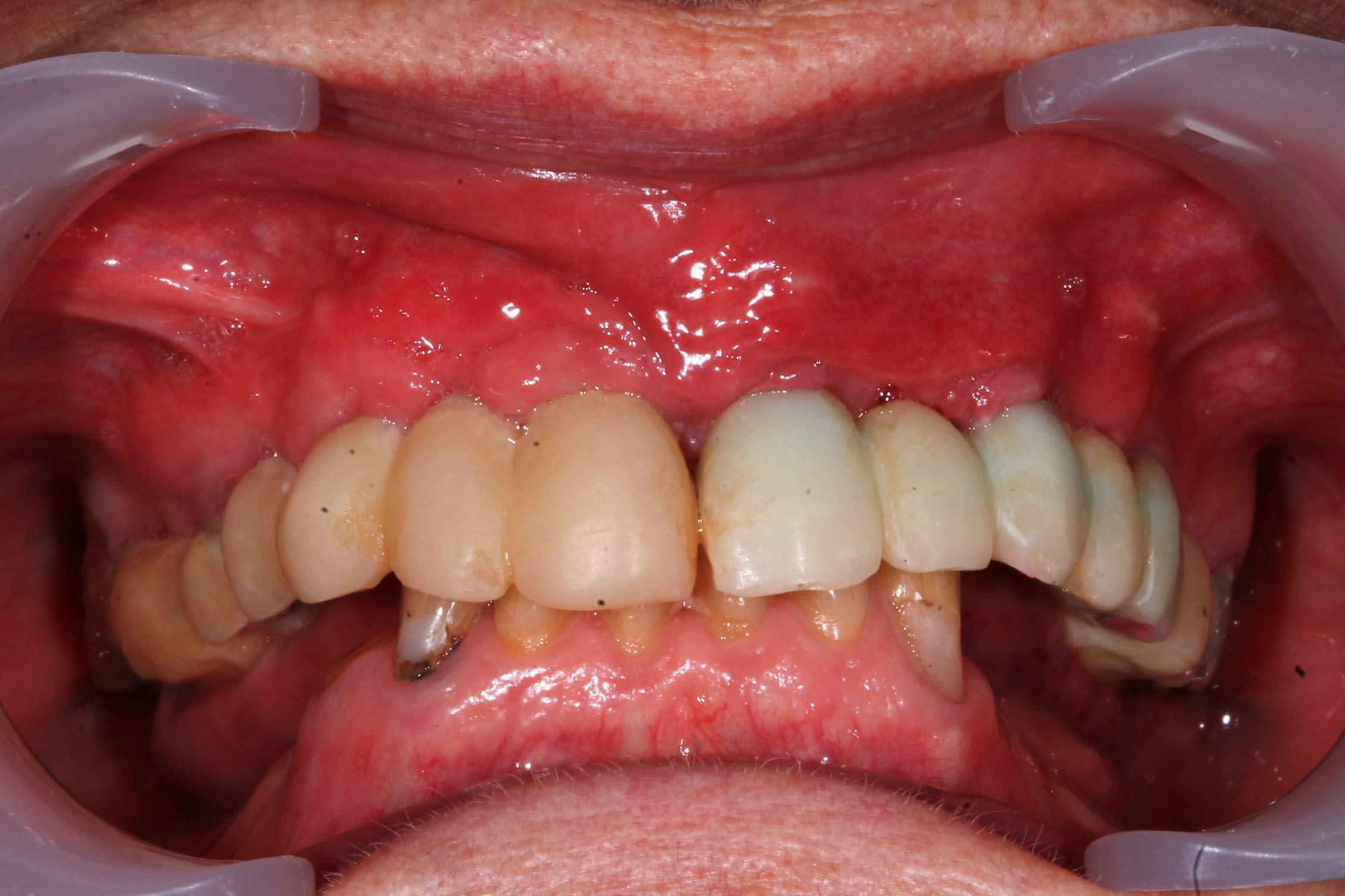 La patiente a un provisoire résine à droite , un bridge sur implant à gauche.