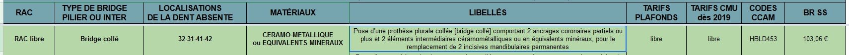 Pourtant le libellé exact est : Pose d’une prothèse plurale collée [bridge collé] comportant 2 ancrages coronaires partiels ou plus et 2 éléments intermédiaires céramométalliques ou en équivalents minéraux, pour le remplacement de 2 incisives mandibulaires permanentes