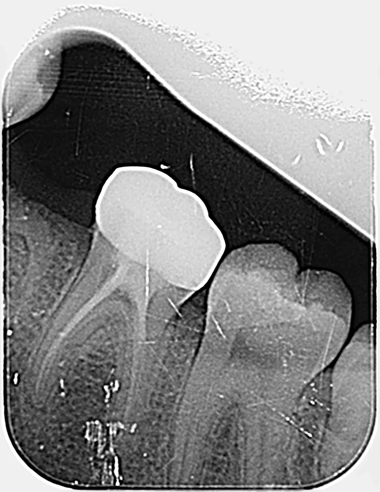 Concrètement, nous pouvons observer une vague radio clarté au niveau de la chambre pulpaire de 36, manifestement pas dans le même plan puisqu'elle est décalée en fonction de l'axe de la radio. Et... c'est tout.