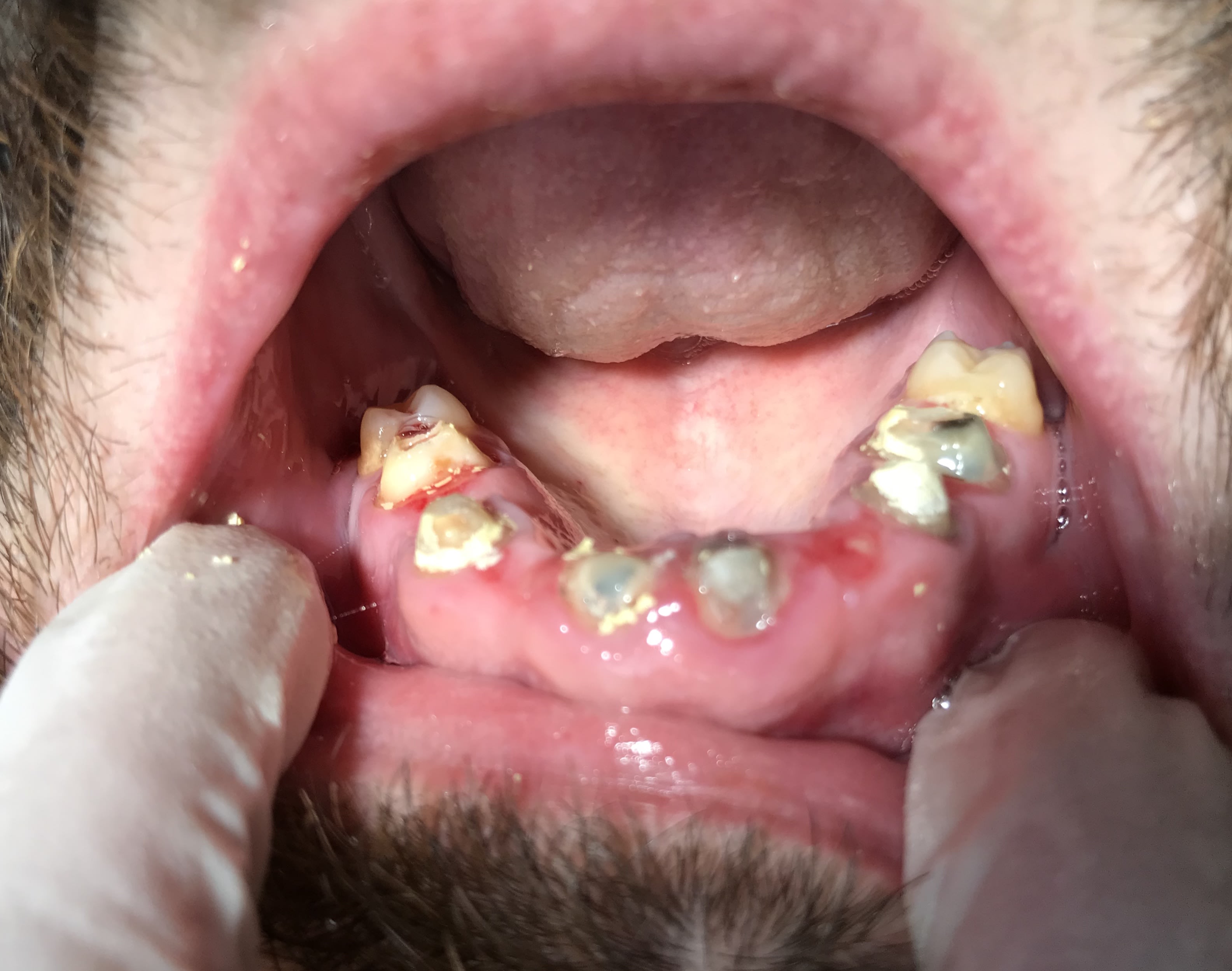 J’ai essayé de conserver et retraiter 11 et 21 , j’attends que ça cicatrise. À la mandibule c’est pareil y a 4 dents manquantes. Plan de traitement 1 implant par dent manquante. Et chaque dents en bouche à retraiter.
