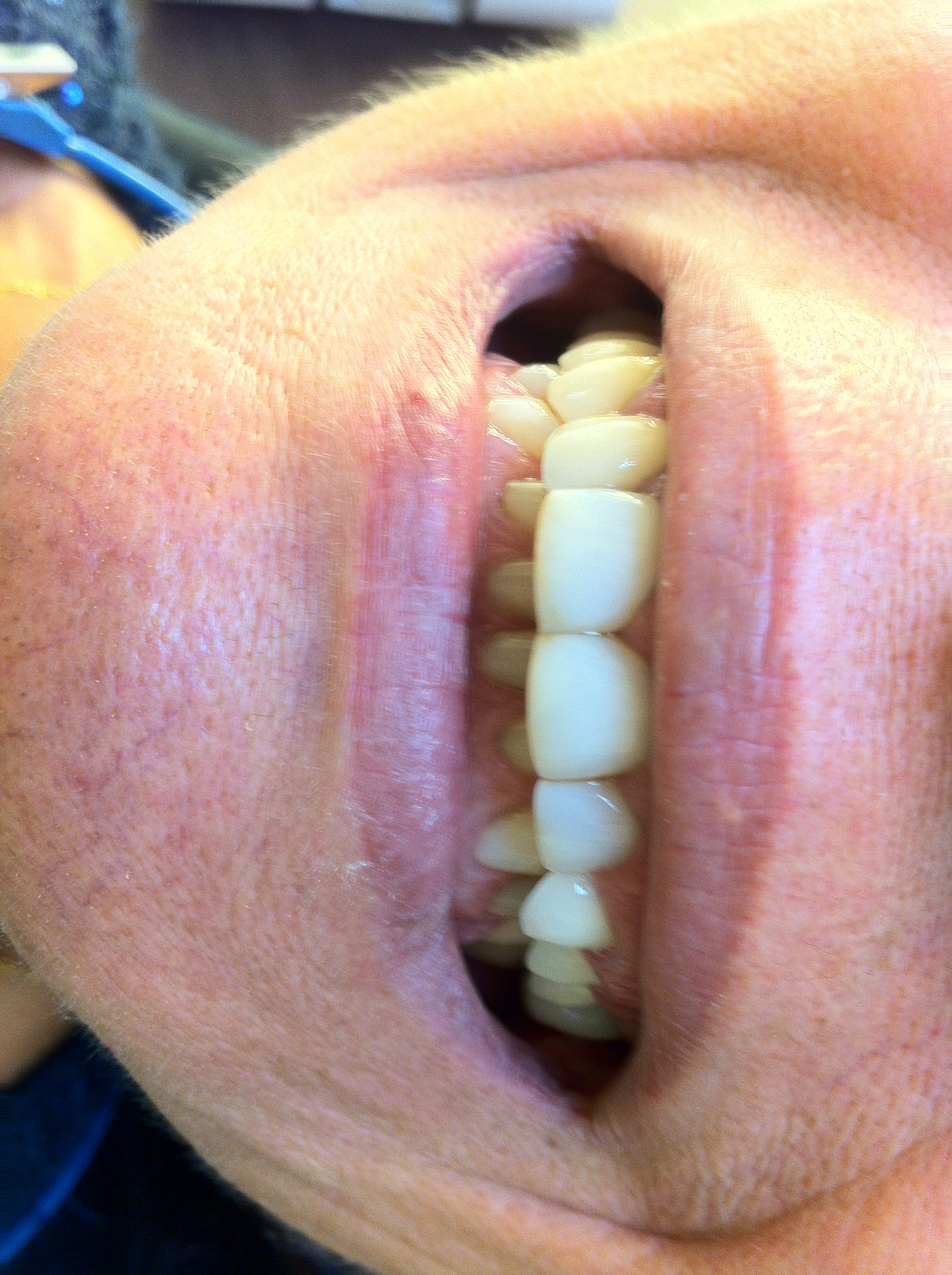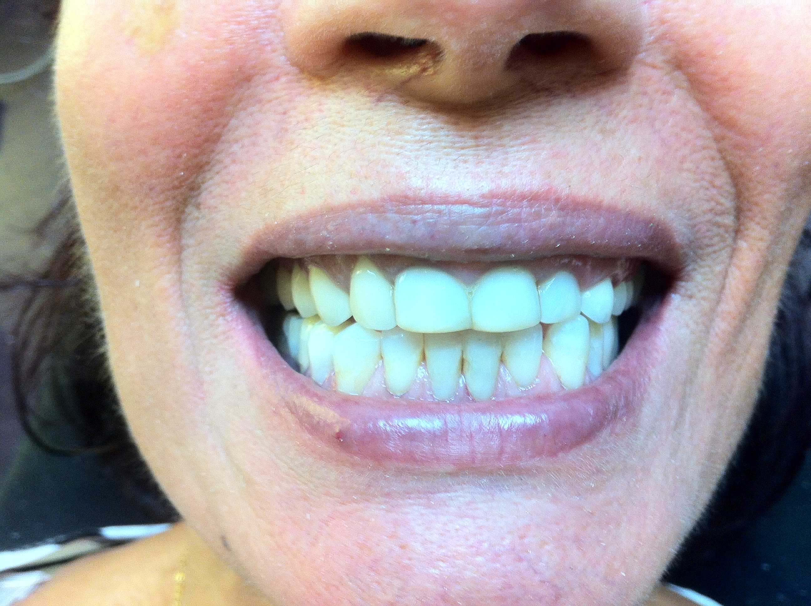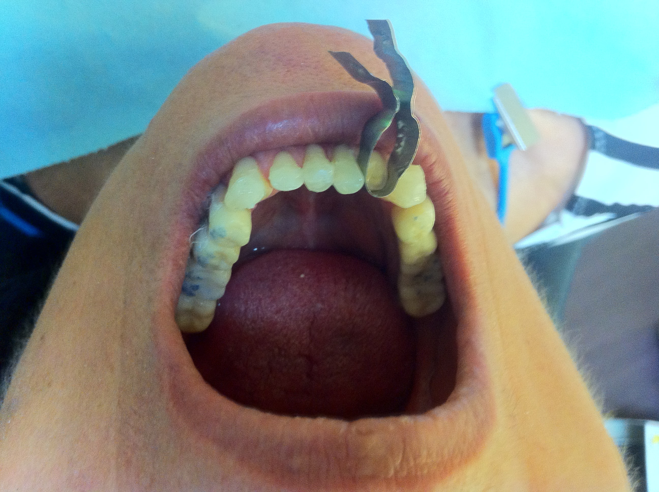 Ici j'ai collé des sortes d'onlay solidarisés sur les bridge posterieurs existant (donc pas forcément ni tres esthetiques ni collés sous digue comme certains me l'ont fait remarquer)et realisé des composites sur les anterieures.
