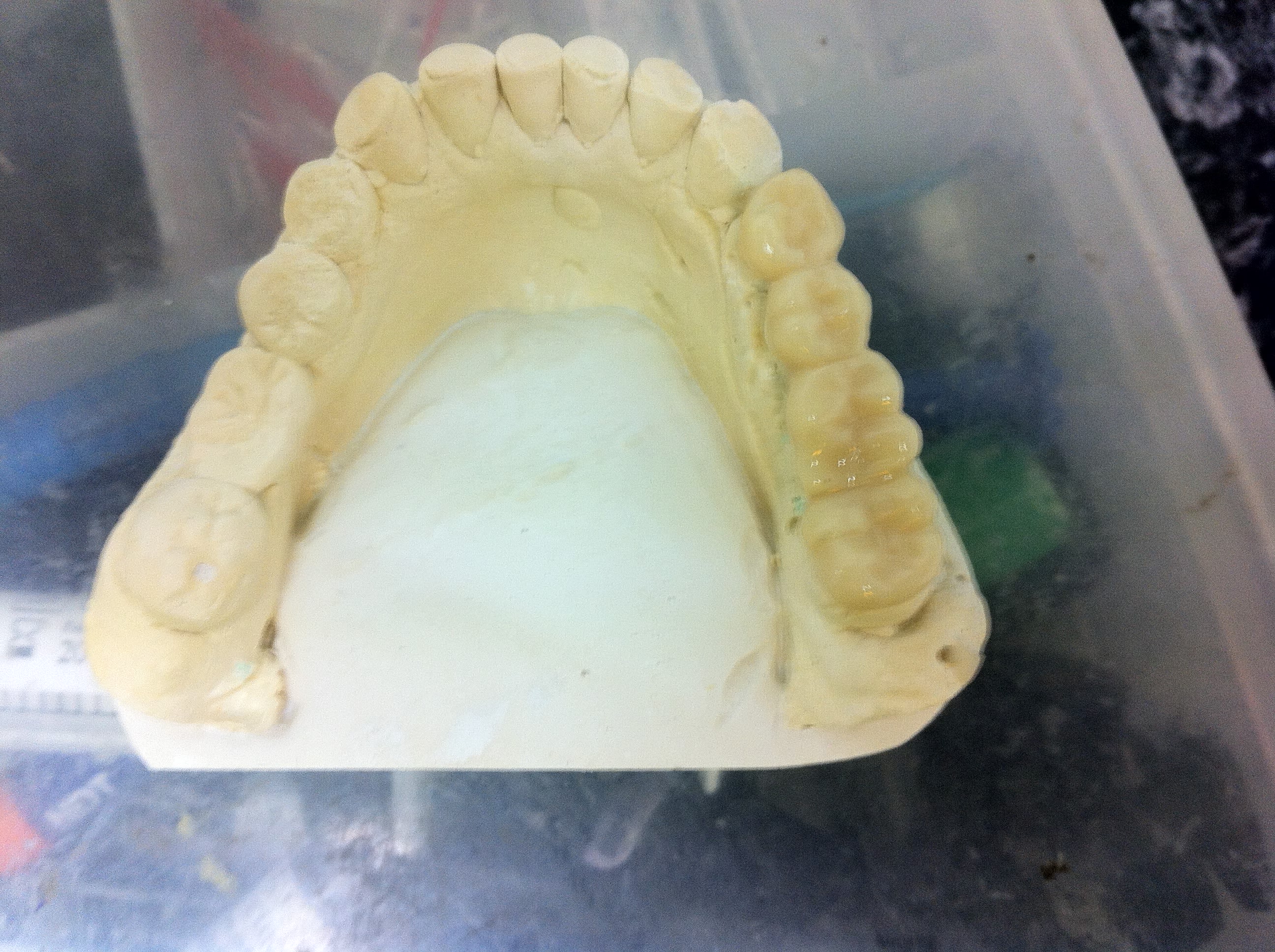 dans les cas de reconstruction etendu il faut tjs commencer le wax par les incisives du bas . le but cherché etant de reconstruire leurs bord libre le plus fin possible . ( comme des incisives non usées .)