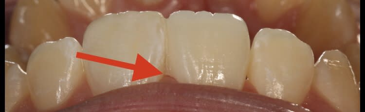 Le fil dentaire est passé entre 11 et 12 puis glissé sous le pontique pour rejoindre aisément l’espace inter dentaire 11/21. La céramique Parfaitement polie est très facile à nettoyer et autorise un état gingival parfaitement sain.