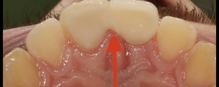 D’autre part tu remarqueras que pour éviter la fracture du bridge , le prothésiste a fait une longue jonction entre les deux dents allant jusqu’à la gencive. Comment le patient va-t-il pouvoir nettoyer au niveau de cette jonction puisque la céramique va jusqu’à la gencive ? Le patient ne pourra pas nettoyer dans cette zone, ce qui provoquera une inflammation gingivale.