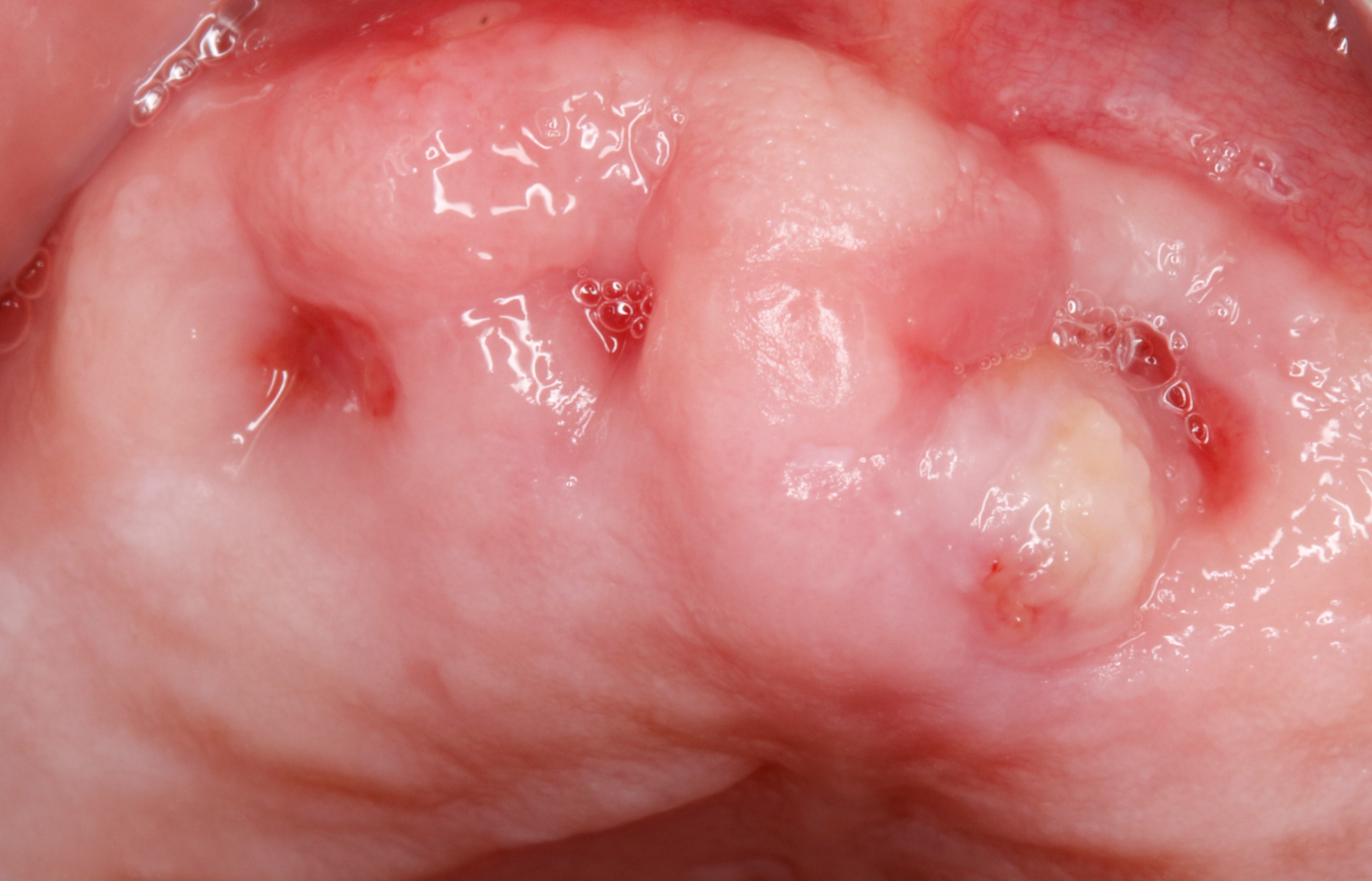 J’ai pas souvent mais de temps en temps ce type de lésion, une sorte de masse molle avec des effets tachetés , tu appuies, ça se perce et du pue s’en écoule. je place sous antibio type bi rodogyl et ça régresse spontanément autour de 2 semaines . si ça persiste, pas joli, il faut,évidemment, envoyer à un stomato. Pour moi pas le feu au lac. Par contre avec une CBS, je calmerai au niveau des curetages.
