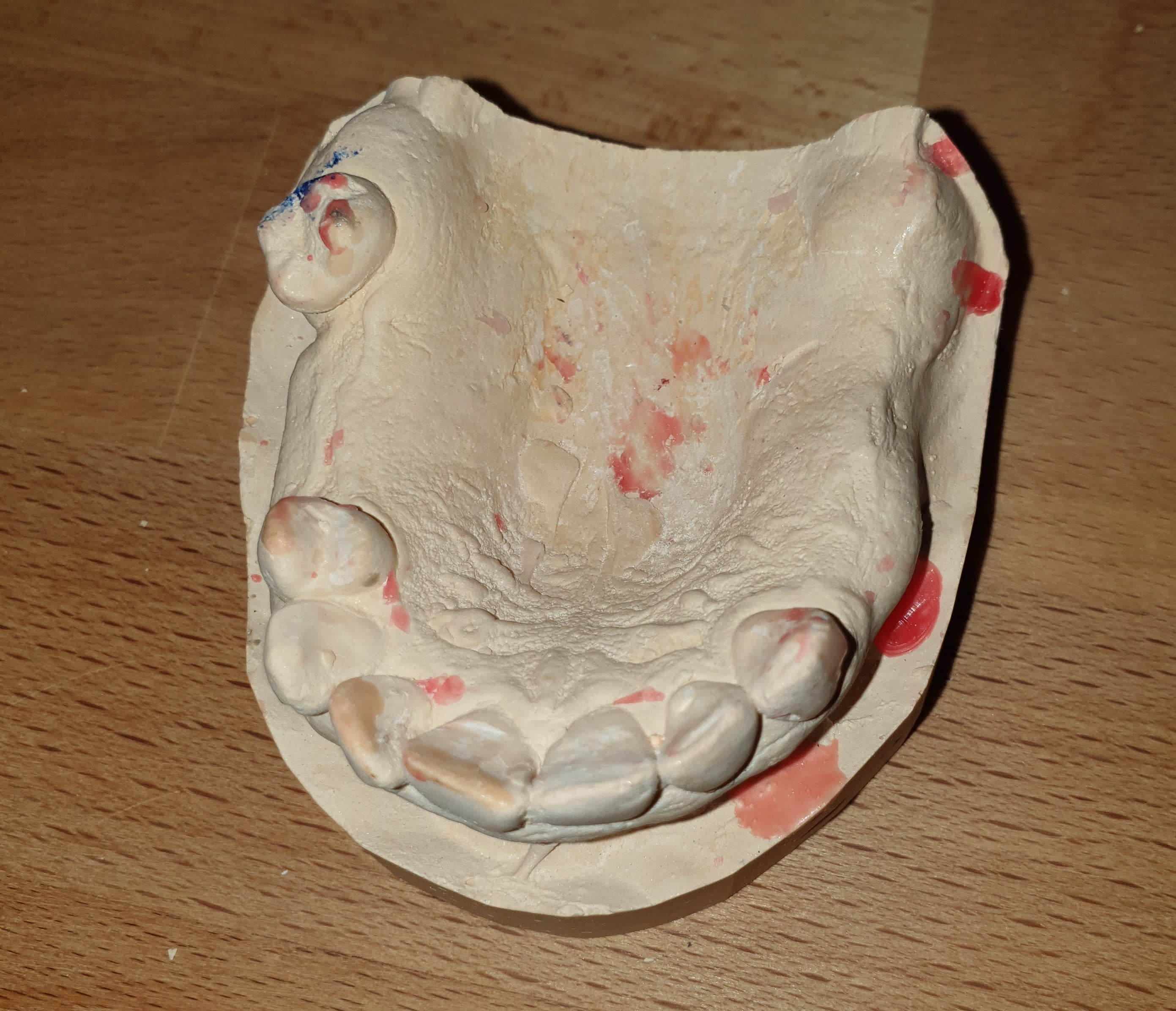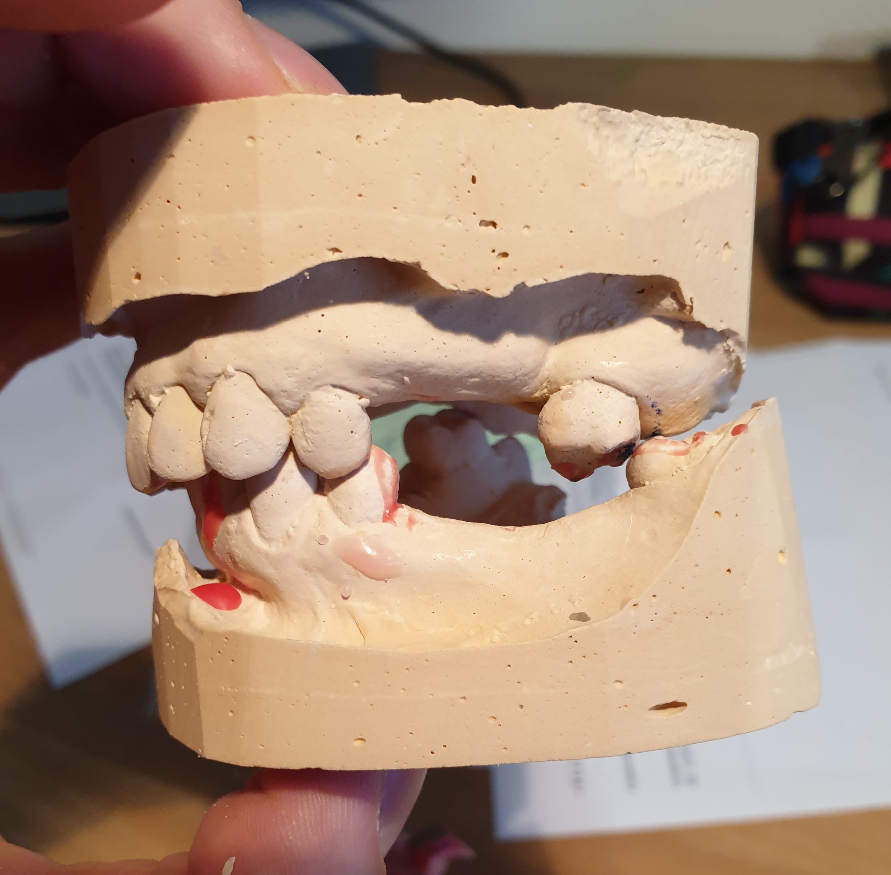 Je peux monter ça sur un articulateur (j'ai fait une cire d'occlusion, ça se voit bien d'ailleurs ^^).