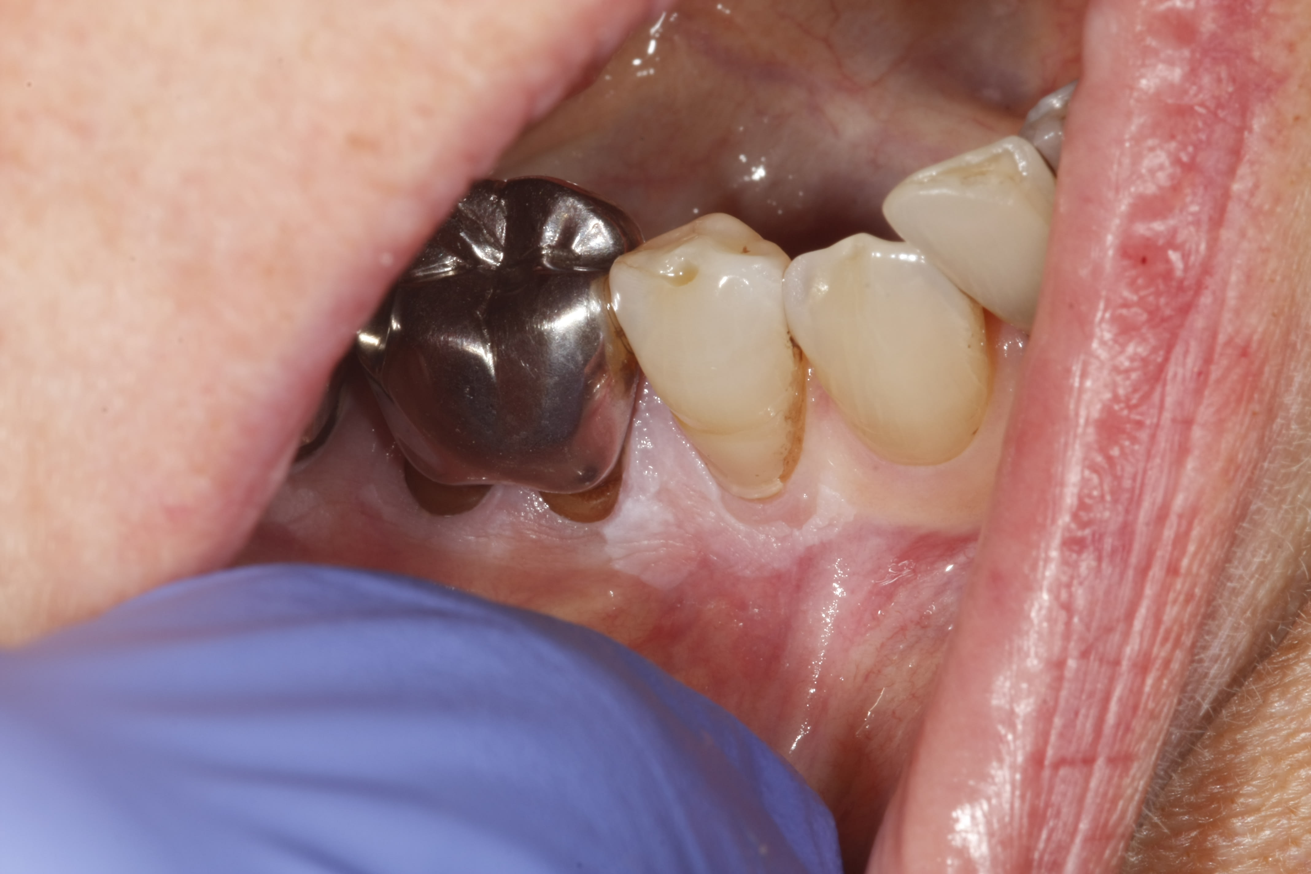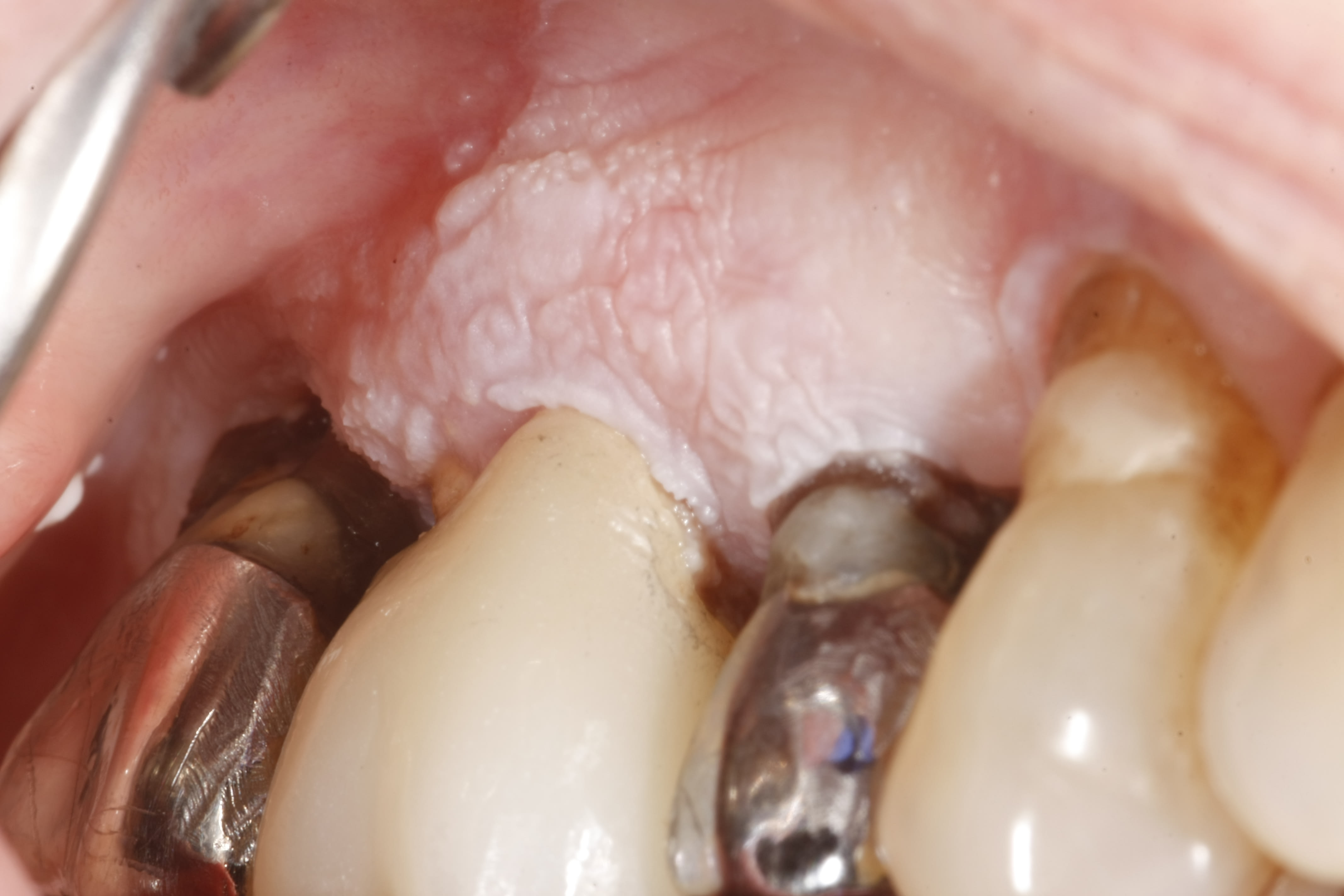 Lésion non détachable, apparue il y a 2 ans approximativement. L'étendue, la localisation varient peu au fil du temps. Les douleurs associées par contre, vont de "gêne" à "douloureux avec la brosse à dent 15/100ème" selon les moments.