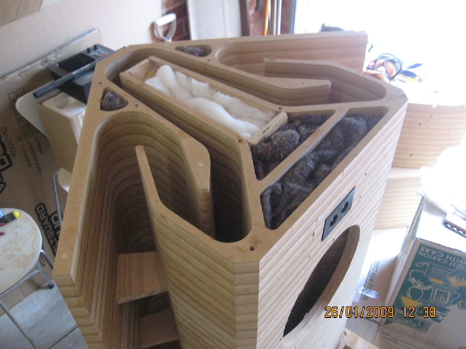 bon , ça pas l air mal , mais sur le kit ils préconisent du medium de 19 , à moi on me la fait pas , je vais refaire les calculs avec du 22 , puis y a des parois creuses , et je me dis , à moi on me la fait pas , je vais y couler du Fuji Rock du cab , puis il fallait mettre le filtre dedans , et je me dis ,à moi on me la fait pas, je vais faire une boite refroidie séparée , puis ils disaient de mettre un peu de mousse de tapette , et je me dis ,à moi on me la fait pas , je vais coller des plaques de moquette goudronnées anti bruit , ils n y avait pas de pieds prévu ,et je me dis , à moi on me la fait pas , je vais prevoir ça .