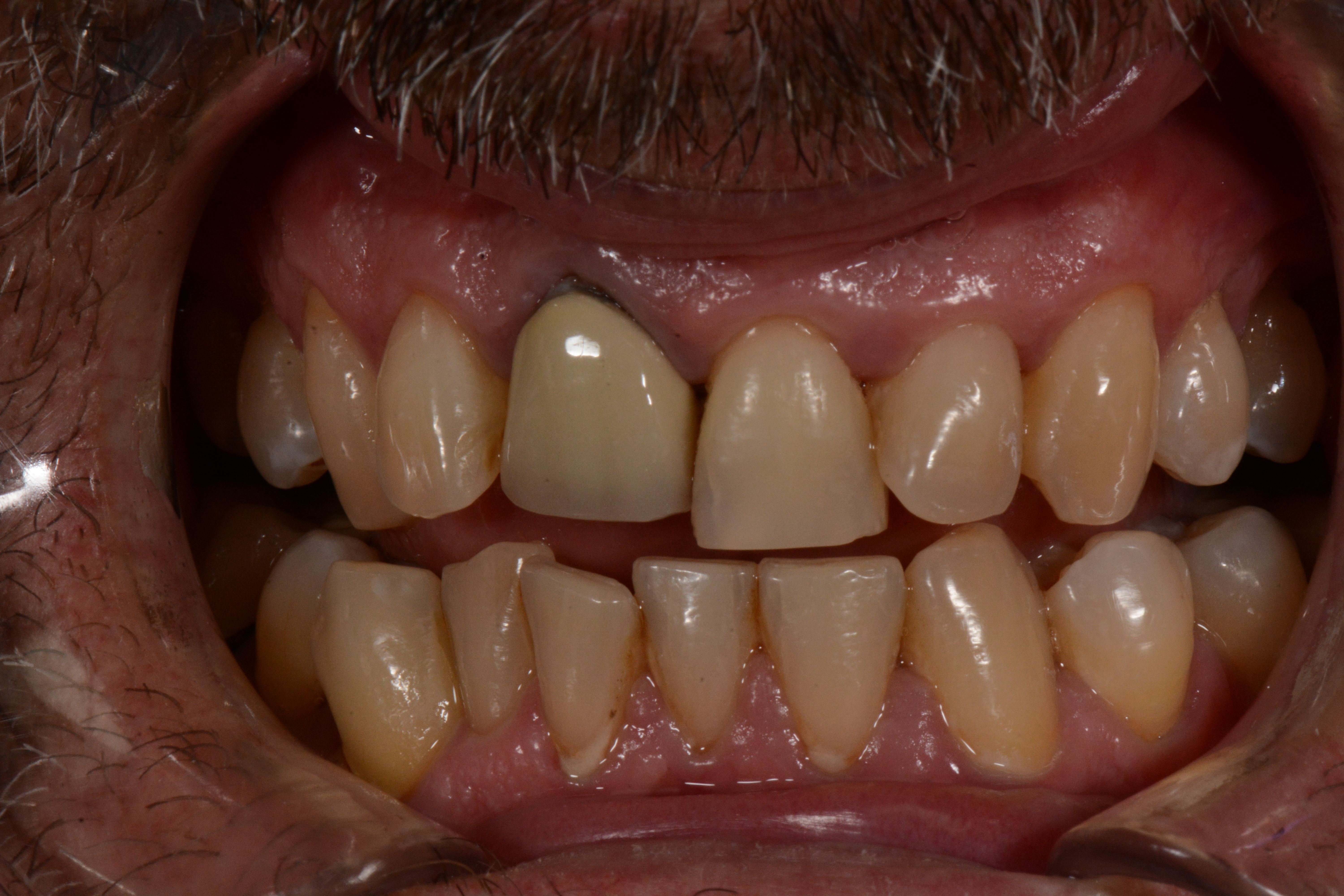 Depuis 2 ans il porte à la mandibule une gouttière partielle 18h/24 (des cales amovibles postérieures reliées par une barre linguale en résine), je n'ai pas la photo. Cela a soulagé ses douleurs chroniques. Cependant à l'examen je constate des contacts en PIM uniquement sur les 7.