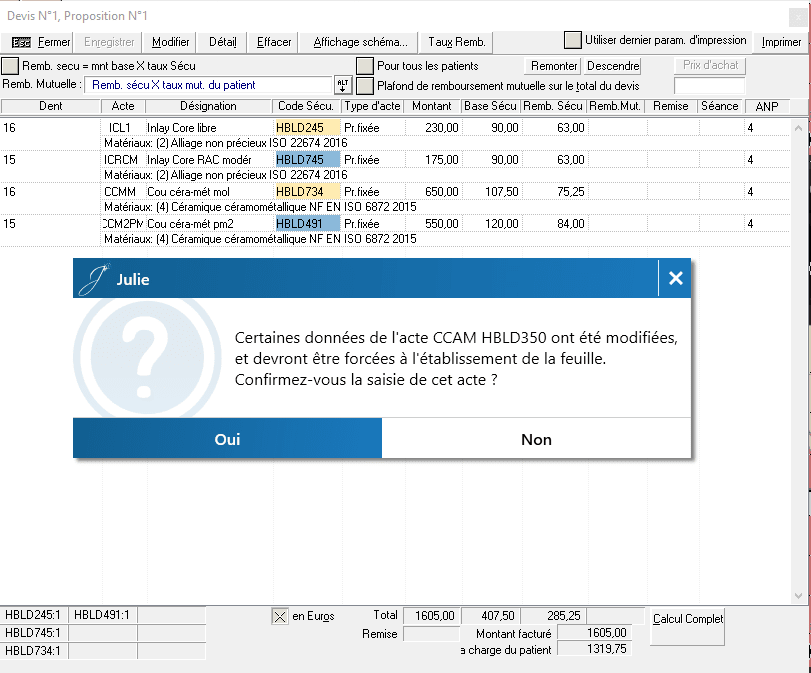 Le libellé est rikiki sur julie pas assez de caractères pour faire un libellé clair. Avant on pouvait paramétrer un type d'acte dans l'onglet matériaux et le faire figurer à la place du libellé de l'acte sur le devis + le libellé CCAM sous l'acte. maintenant aucun des 2 s'affiche.