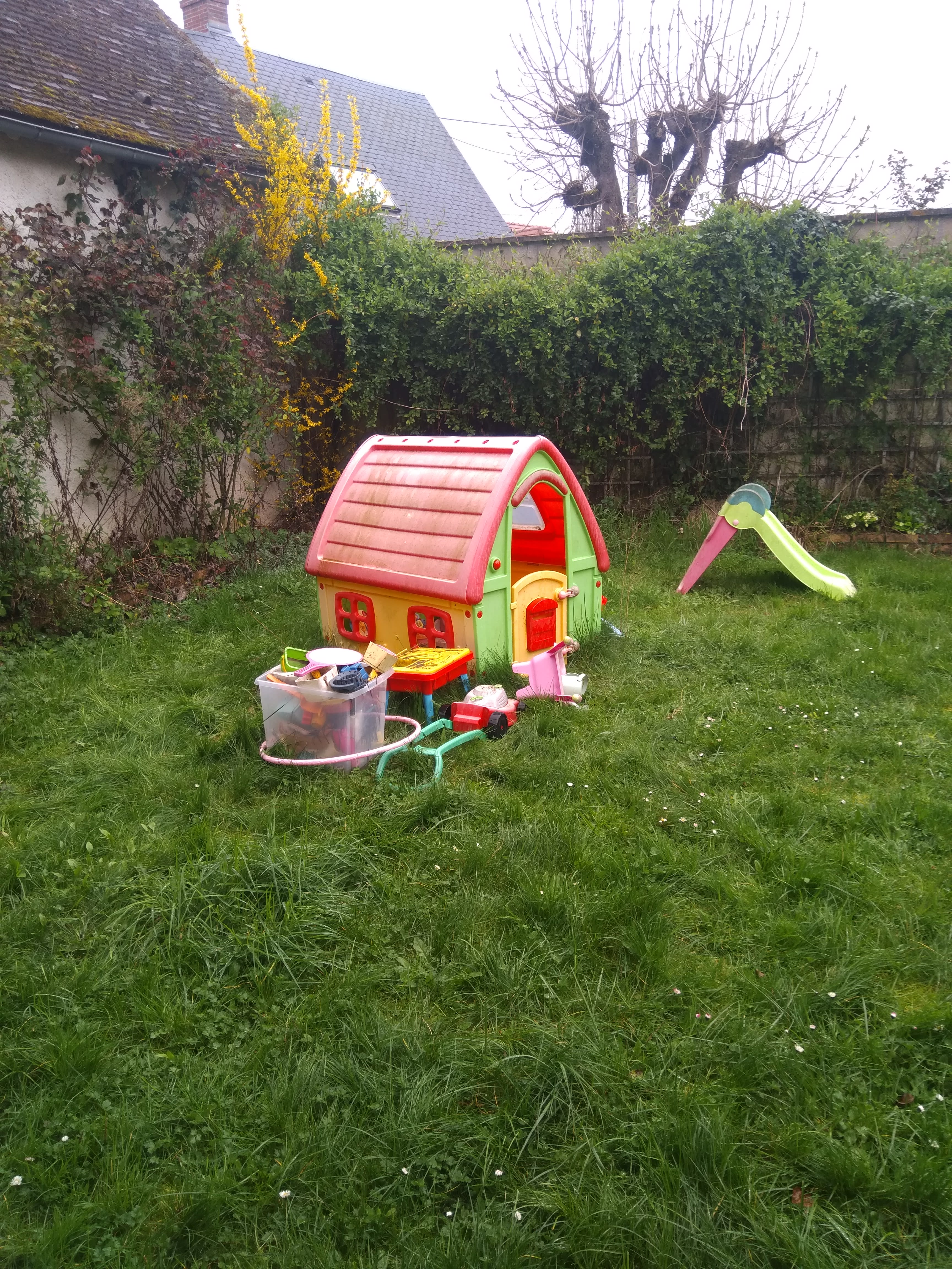 Suis dans le jardin, il pleut, c'est toujours mieux qu'enfermé... vu mon premier mulot de la journée... je vais peut être m'abriter dans la cabane des petits...