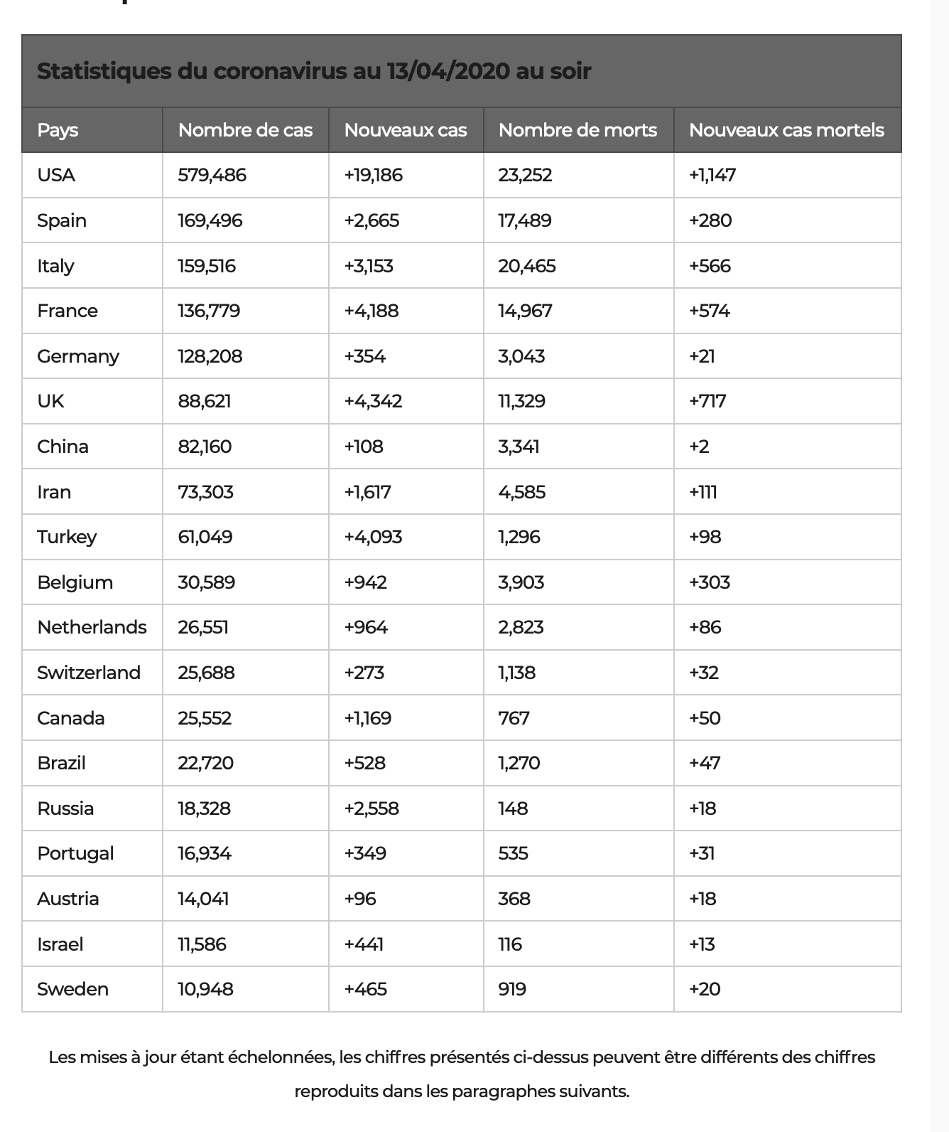 Macron essaie de rattraper le coup, mais le mal est fait et les morts sont là. Nous avons été quasi aussi mauvais que l’Italie et l’Espagne, pays qu’on prend souvent de haut. Quand je pense qu’on veut discuter d’égal à égal avec l’Allemagne.:))) Ce pays nous est supérieur à tous les niveaux. D’un coté de la frontière nous avons des amateurs, et de l’autre des gens qui gèrent beaucoup mieux les choses à tous les niveaux .