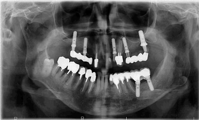 Evidemment commencer par l'assainissement de sa bouche par les soins locaux (histoire de tester sa motivation) mais je serais encore plus radical quant au traitement et au vu du tableau : tu élimines tous les pathogènes en retirant tous ses implants et les dents restantes (axes implantaires aberrants, dents perdues, terrain fragile) et tu fais une reconstruction osseuse, ou plutôt tu fais faire, par prélèvement pariétal sous AG!!!