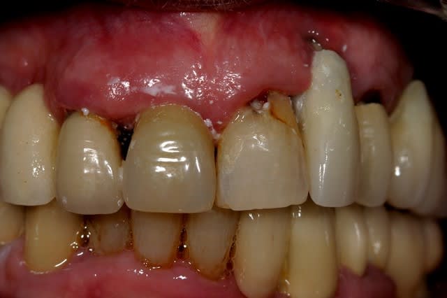 Je ne veux pas opposer petit bridge et gros comblement mais à vouloir minimiser les travaux, on induit dans l'esprit des patients des idées fausses qui peuvent mener au clash, et donc la solution stable dans le temps et qui lui rende service c'est reconstruction osseuse + bridge complet sur implants.