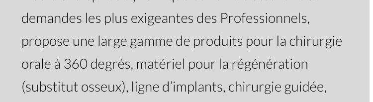 Avec mes petites années d’expérience, je dois avouer que j’ai eu très très très peu de merdes avec cette marque. Je dirais même que les très rares échecs étaient entièrement de ma faute. Donc produit remarquable. Autant la trousse et les forets ne payaient pas de mine, autant la qualité des implants , leurs formes , leurs spires , l’état de surface , la conception , et l’inventivité de cette marque étaient tout simplement au top. A-t-on une fois entendu un seul poseur d’ implant direct se plaindre de la qualité de leurs produits !?! Ceux qui ont critiqué cette marque sont ceux qui n’ont jamais posé de l’implant direct.