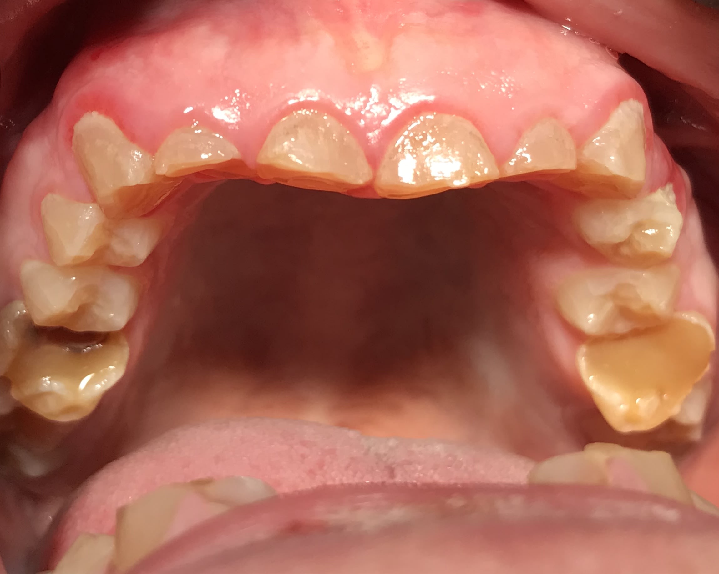 L'amélogénese imparfaite, toutes les dents sont touchées à égalité; et l'émail a un aspect visuellement altéré.