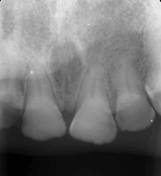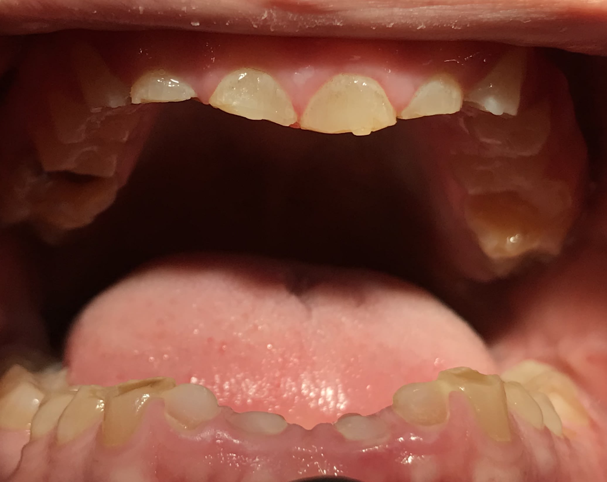 poignée de porte a diagnostiqué une maladie genetique, c'est un cas d'amélogenèse imparfaite avec racines courtes, obliteration des chambres pulpaires, émail fin et de mauvaise minéralité pour du collage... necrose en lien avec l'usure (les incisives inf)