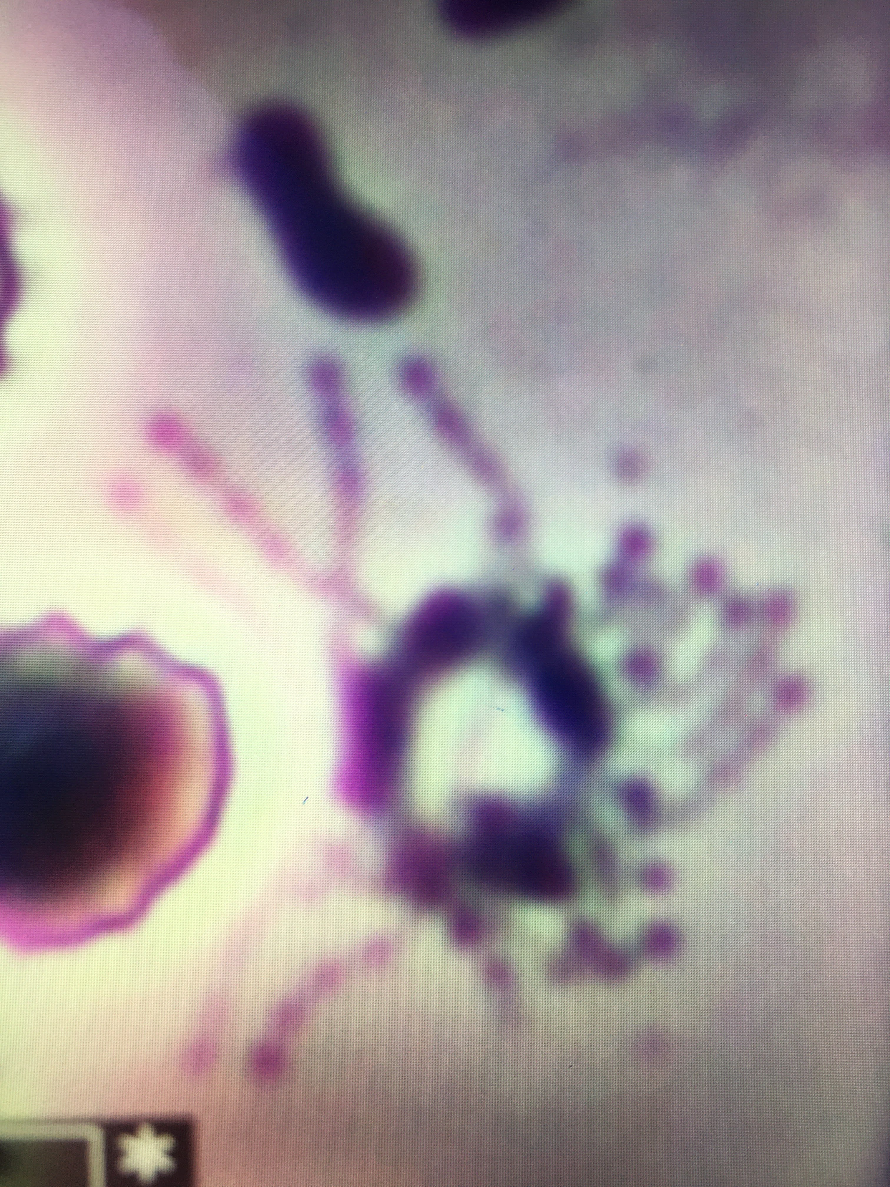 La goutte de sang diluée montre ce qui suit, mais il a fallu attendre 6h pour que le monstre sorte. Pas de coloration. "Aurore borréliale", borrélia en collier de perles.