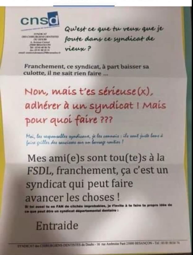 Si tu veux nous vendre ta "came syndicale" parle-nous des avancées obtenues par la FSDL en tant que 1er syndicat dentaire de France ....................