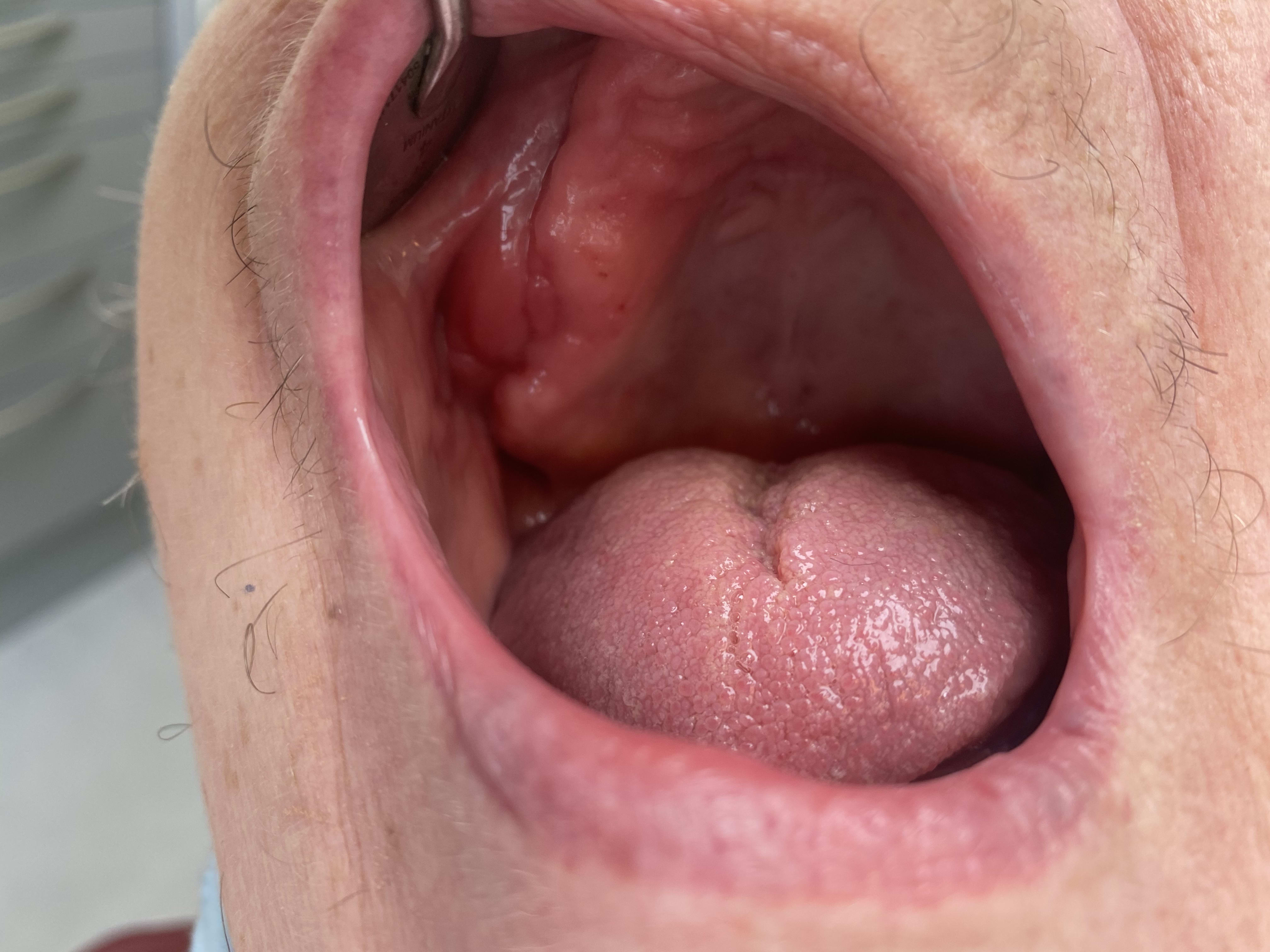 Je découvre en regard de 16,17 extraites en décembre (avec alveolectomies, non sans peine) une lésion de 2-3 cm dans le fond du vestibule un peu fluctuante, non douloureuse à la pression.