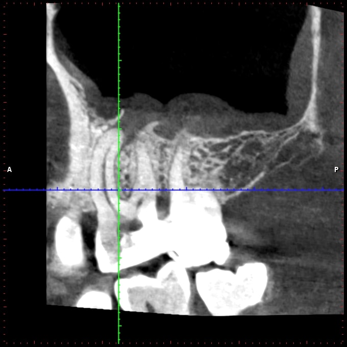 Je fait une cbct: 4 canaux, lésion infectieuse sur chaque racine et surtout, ce qui ressemble à une résorption interne de la racine palatine.