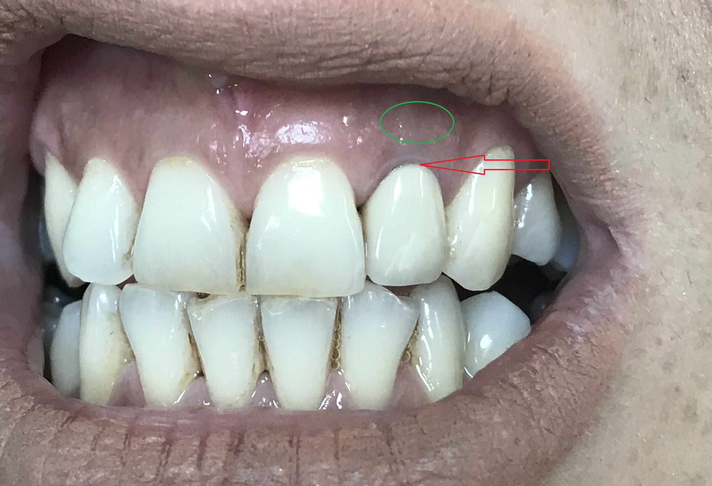 et si tu regardes la photo de Sethef , on voit le meme genre de truc , une zone en depression avec de la gencive qui parait molle , non soutenue , à mon avis c est le meme cas .