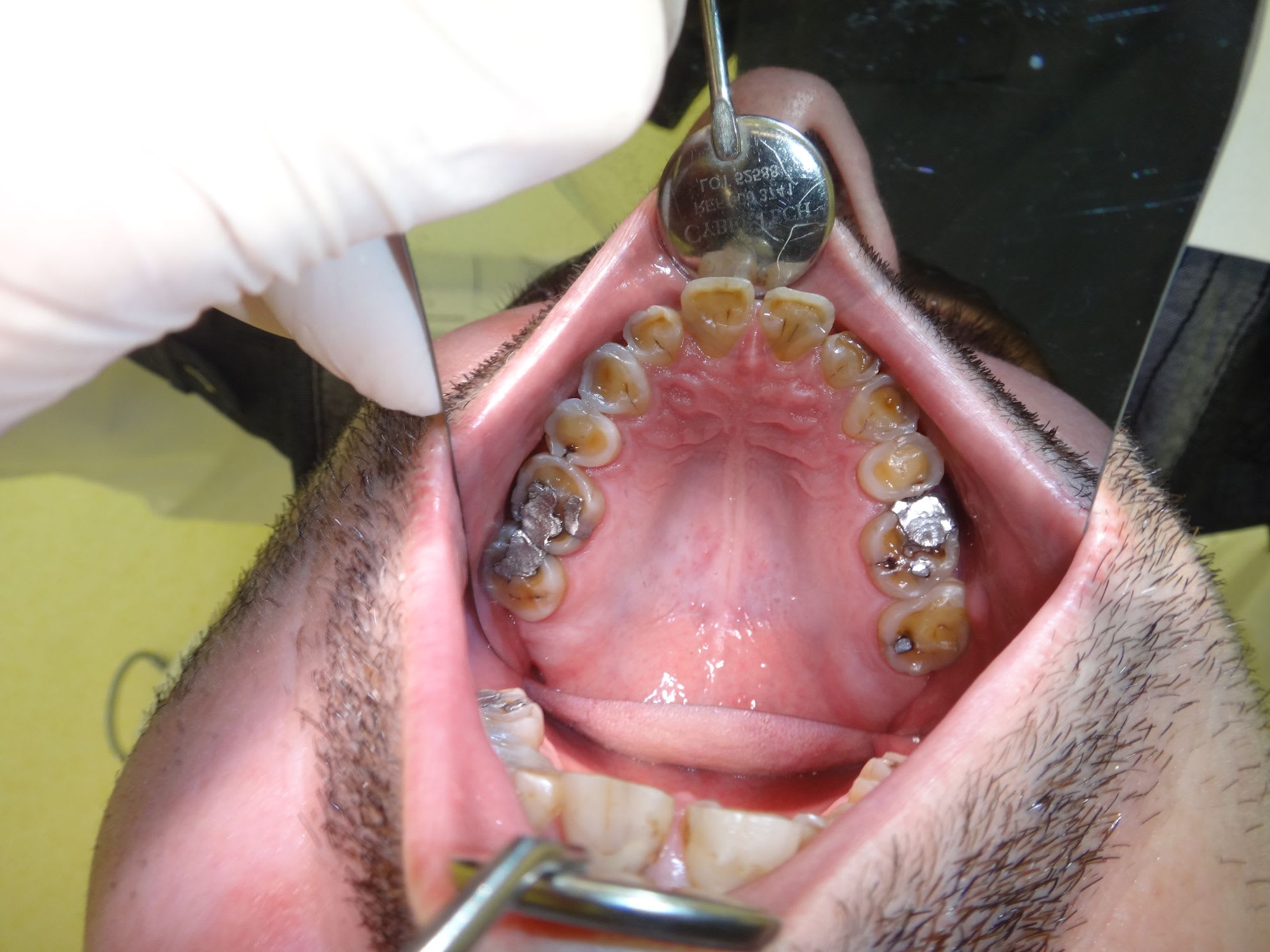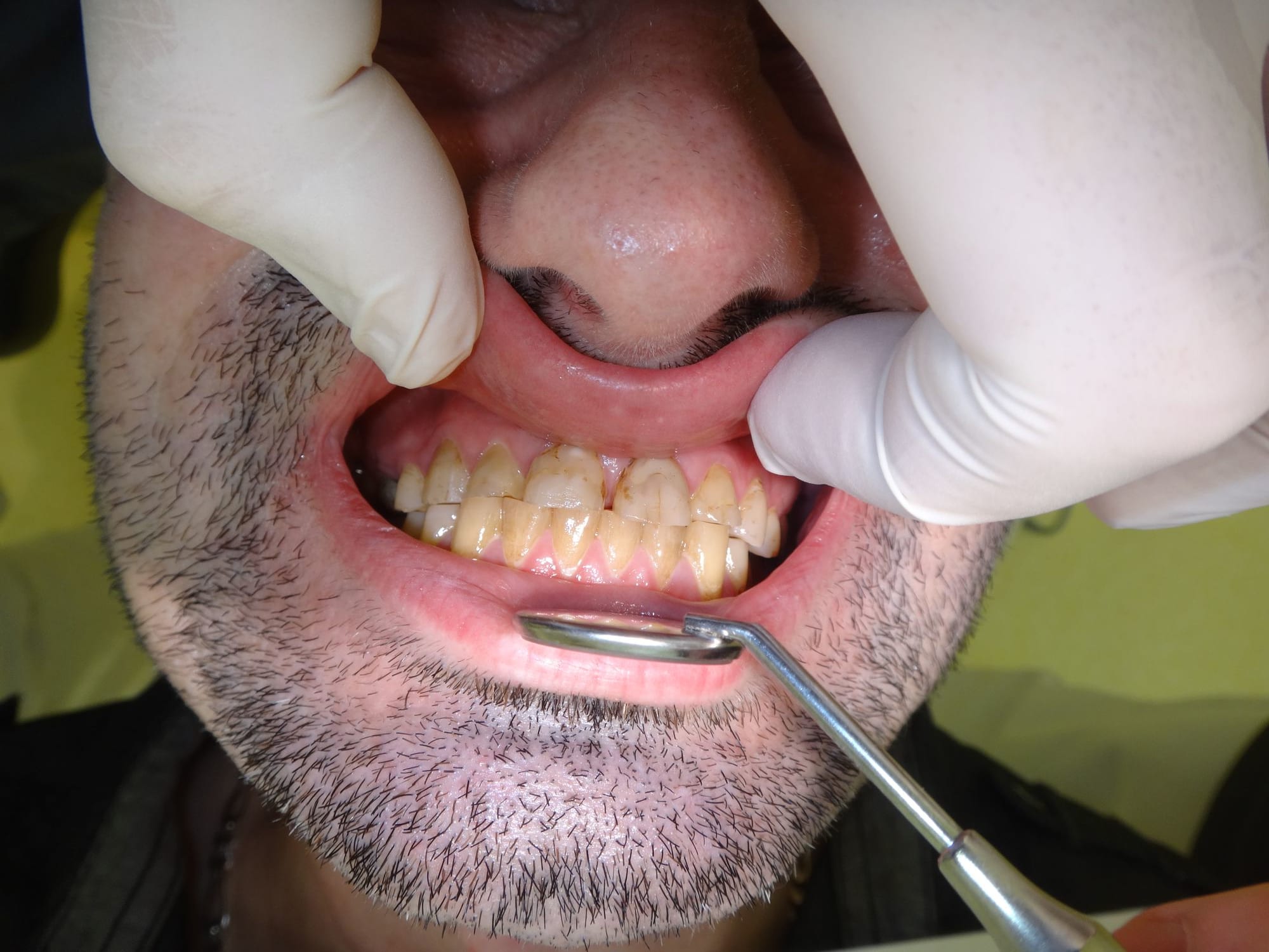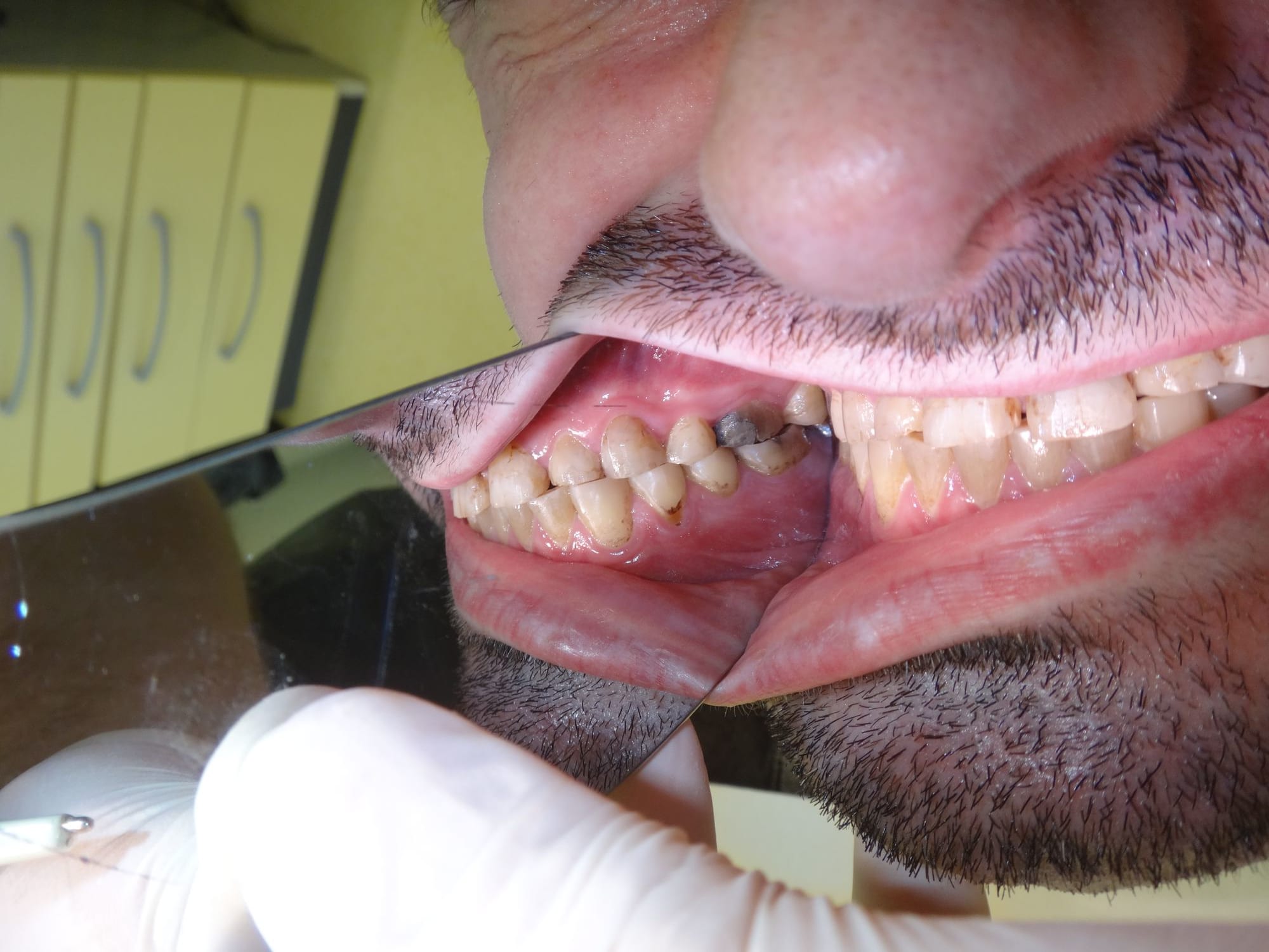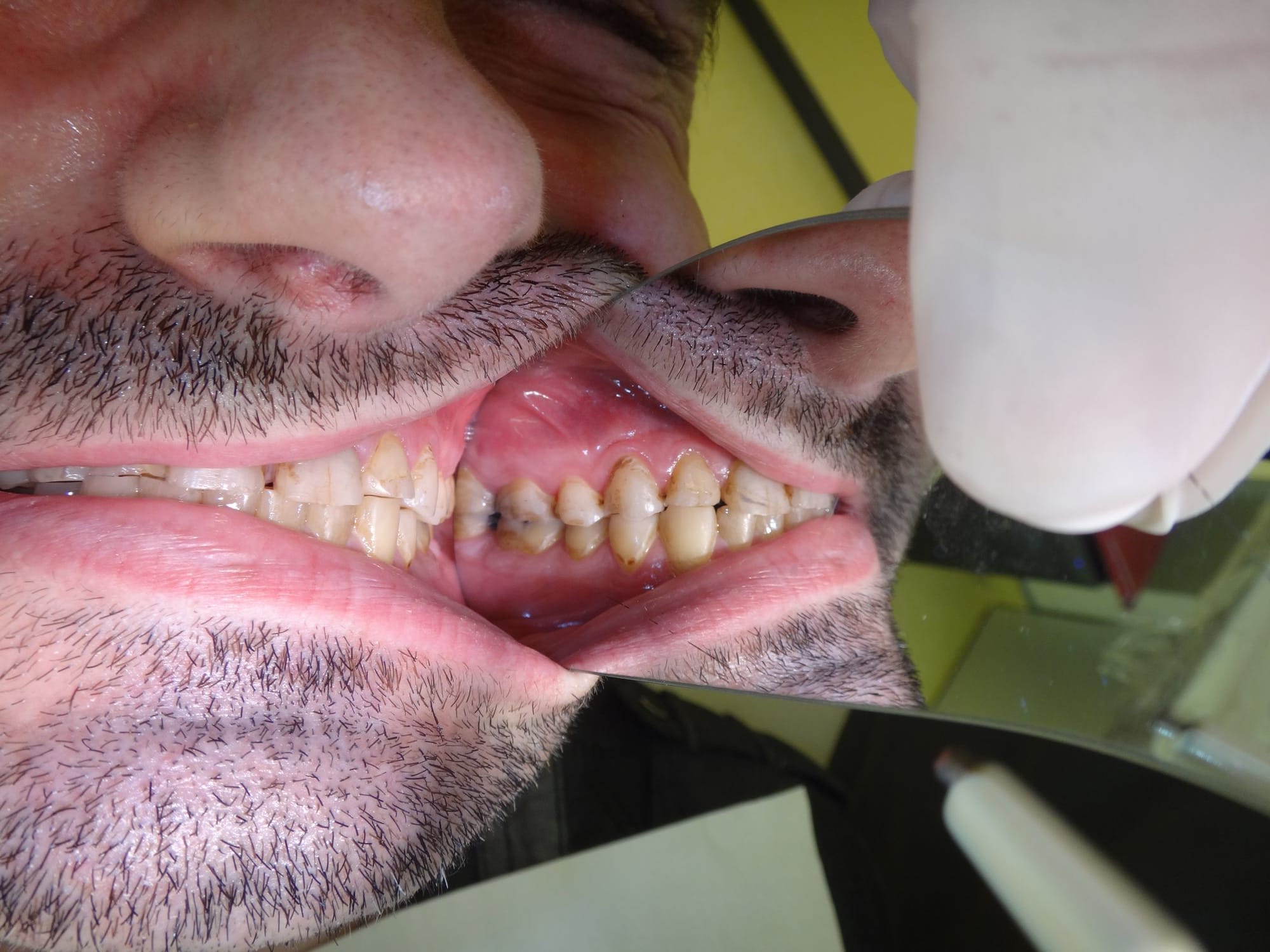 1/ Toutes les dts st abrasées, pas ou peu de déchaussement gingival et mobilité des incisives sup, pas de résorption radiculaire plutôt une arthrite ligamentaire. Pronostic de perte des incisives engagé à moyen terme.