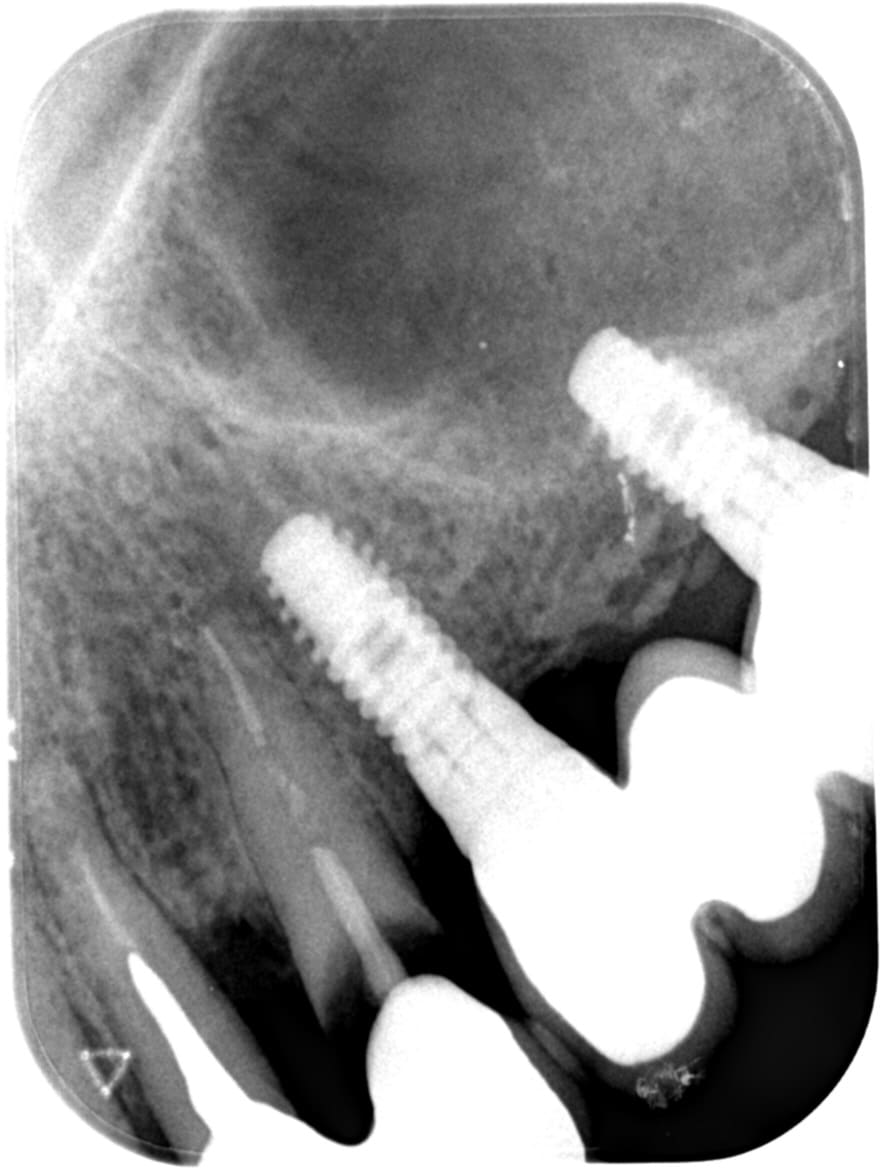 Ensuite je ne suis pas sûr que je prendrais le risque d'une MCEI avec un contexte infectieux aussi avancé en bas (paro terminale+periimplantite...). Quitte à implanter en haut en laissant le bas en l'état, je partirais quasiment sur du 2 temps !