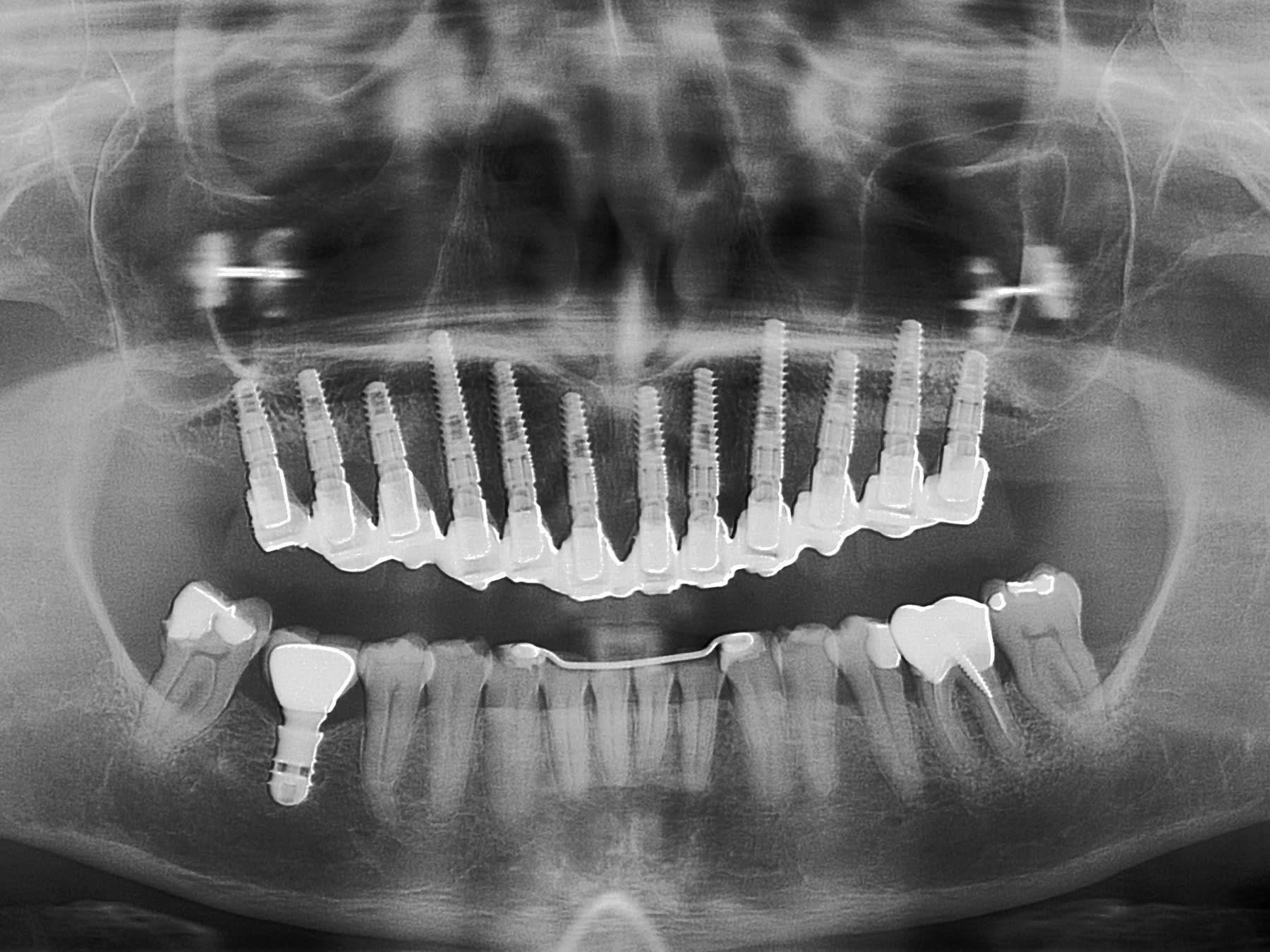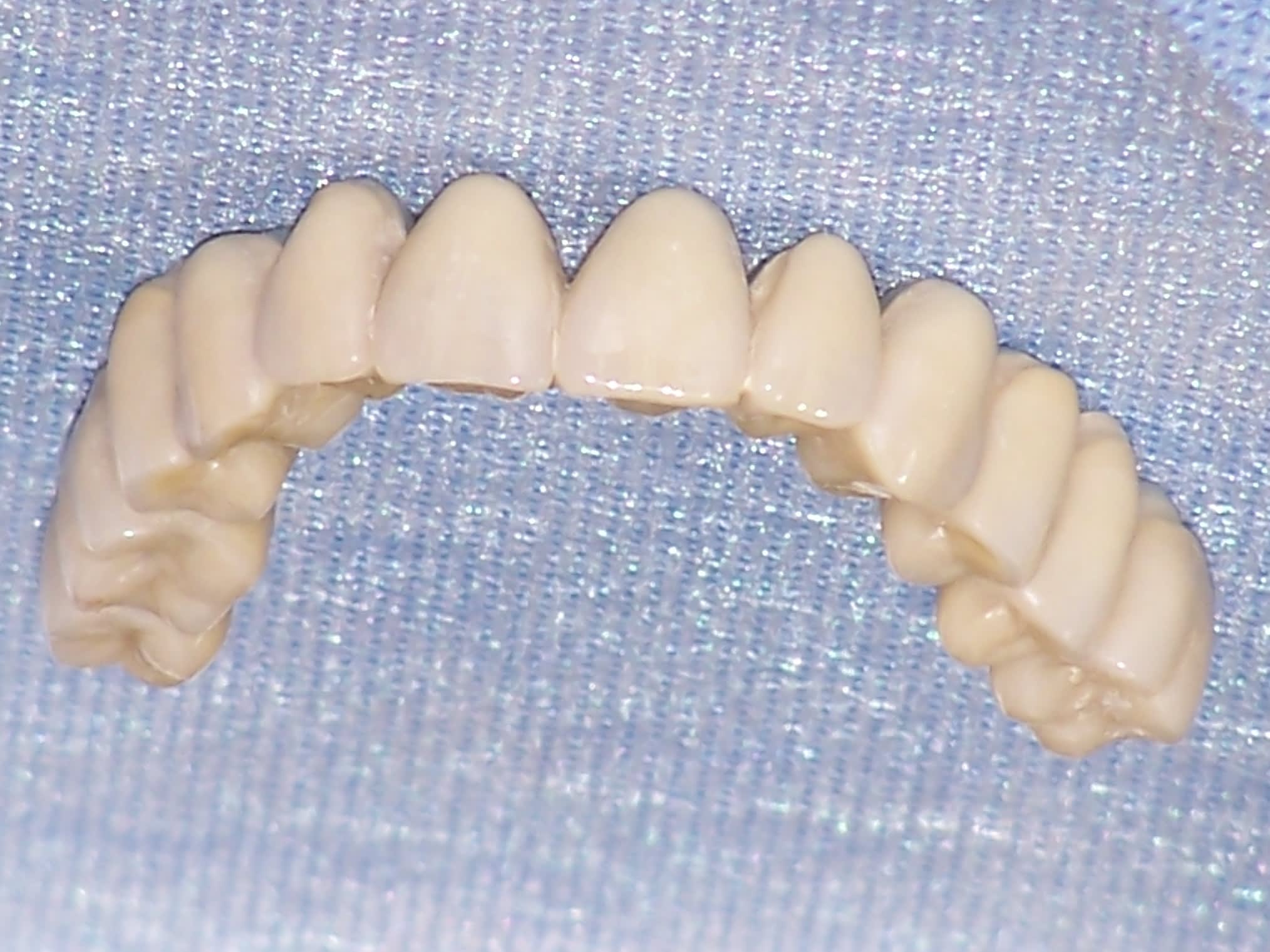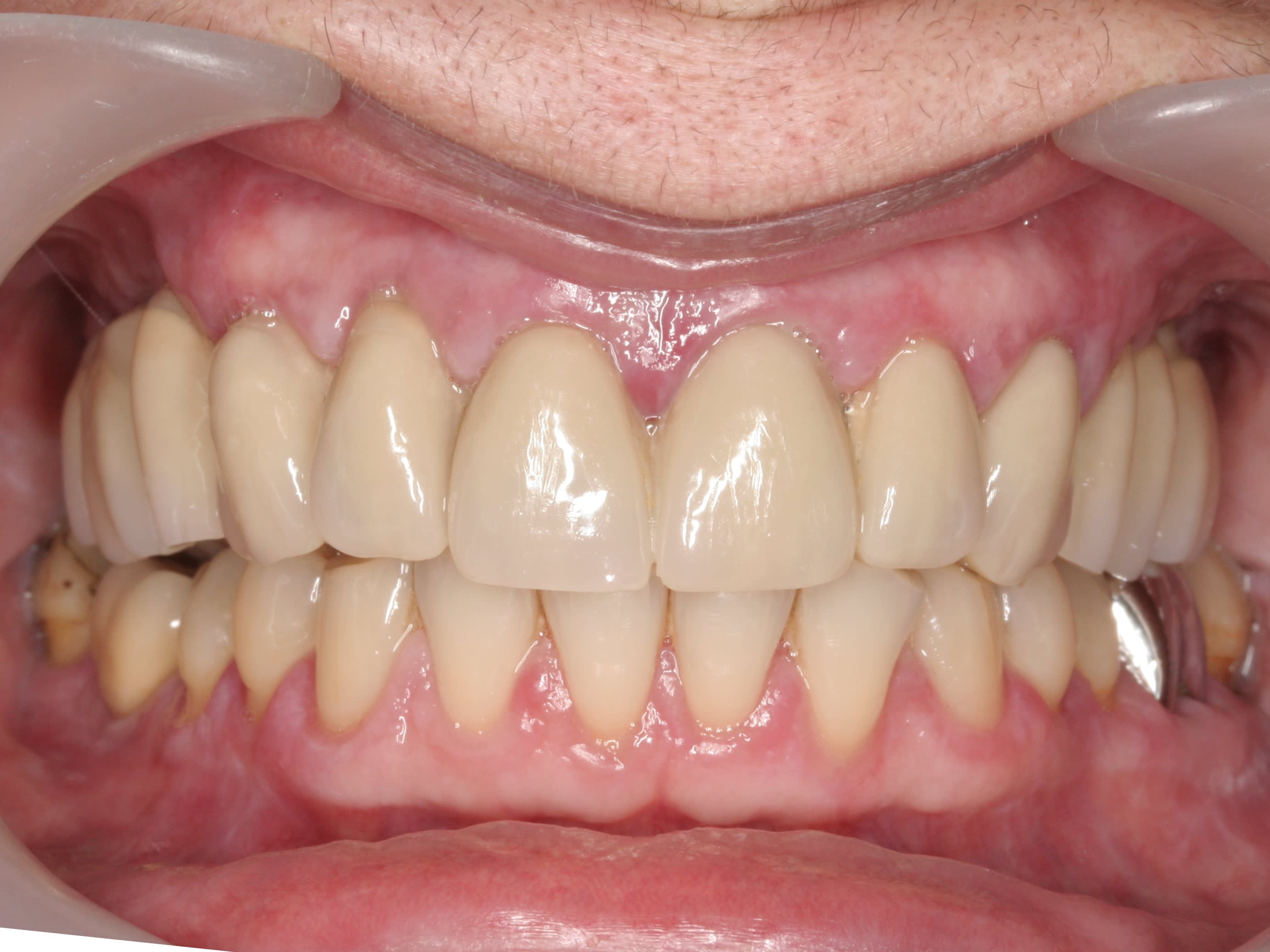 Mise en charge immédiate post extractionnelle de 12 dents, de 12 implants avec un bridge à armature rigide métallique rigide fixé par friction sur pilier de prothèse implantaire pour fixe, en 1 seul temps chirurgical.