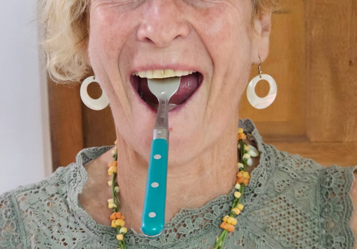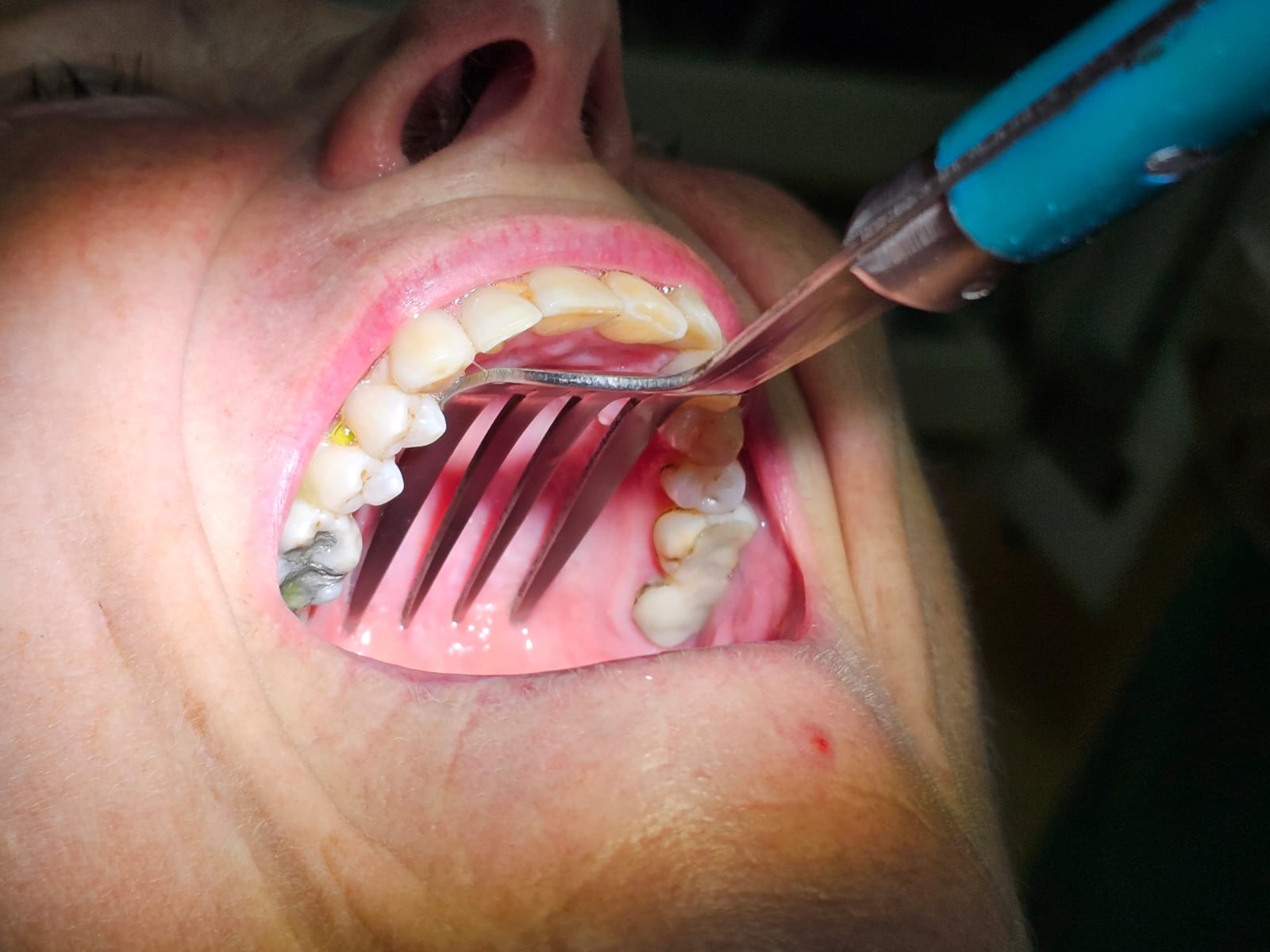 Solution trouvée : anesthésie des prémolaires cas trop de douleur aux vibrations et fourchette coupée à la fraise transmétal. Avec une dose de dérision pour dédramatiser la situation.