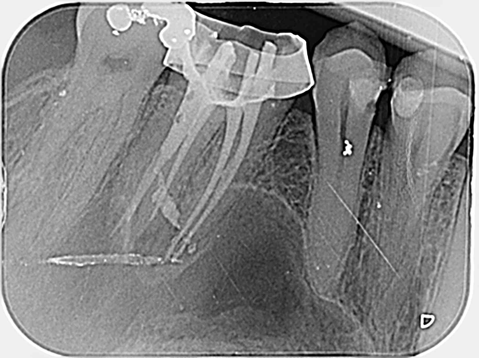 A l'examen, rien de particulier à signaler. La dent est sensible à la percussion axiale et transversale.