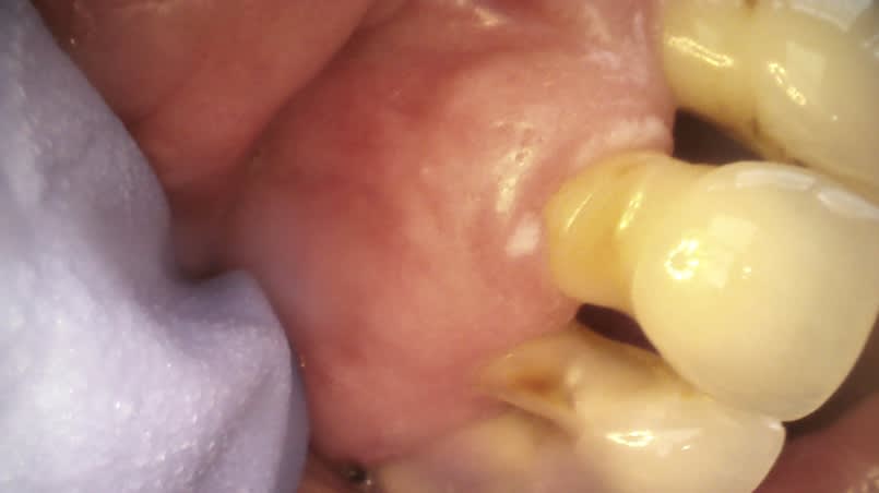 J'ai reçu une patiente hier qui présente depuis 1 mois environ une petite plaque et un point kératosique au niveau du collet de sa 21.