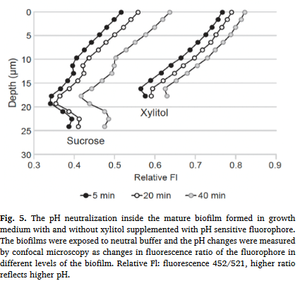La figure 2 ci-jointe présente un biofilm avec ajout de glucose et seulement 4% de xylitol : en environ 5h, le pH atteint la valeur critique de 5.5 5h sans xylitol, contre 7h avec xylitol (et suivant le type de souche de S. Mutans). Tout l'article est intéressant, en particulier le biofilm avec xylitol est à la fois moins épais et permet de réduire la chute de pH à l'intérieur (figure 5), ce qui conforte l'idée que le xylitol non seulement augmente le pH mais également aide à réduire la formation de plaque...