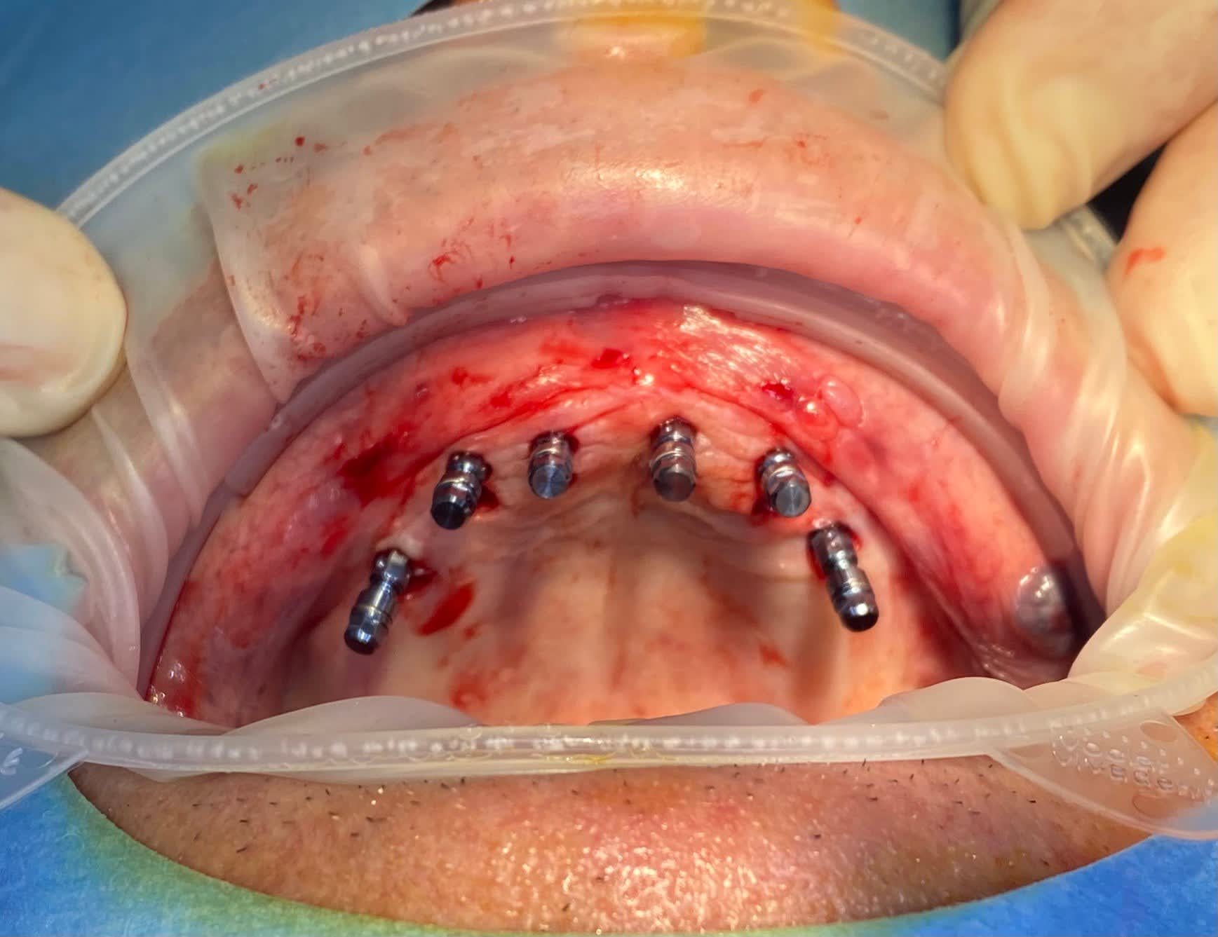 Pose de 6 implants Straumann SLactive maxillaires, avec guide chirurgical complet full-guided en flapless. La prothèse amovible actuelle du patient sera stabilisée sur 6 Novaloc dans 6 semaines le temps que le patient donne le feu vert pour la prothèse fixée.