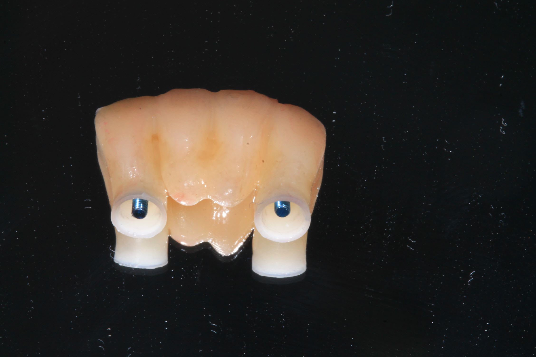 Si c’est une question de temps, il faut deux heures à Dimitri Pascual pour poser un bridge full zircone fait à l’avance, avec une guérison incomparable des tissus par rapport à un bridge résine collé en bouche sur pilier prov.