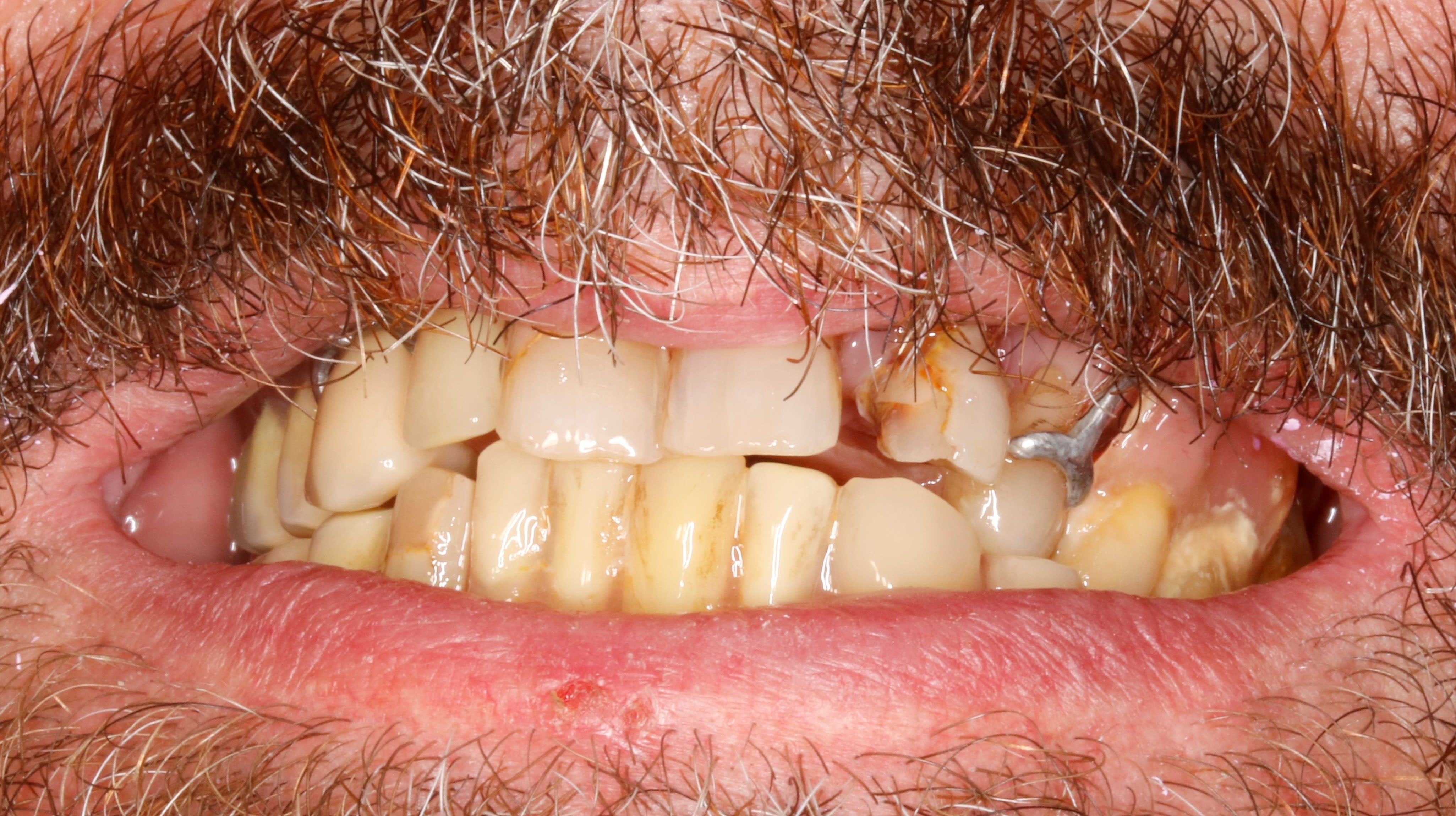 Question subsidiaire, il a quoi à la mandibule? Parce que je ne distingue pas grand chose en distal des canines. Et traiter de l'antérieur dans un tel état paro et occlusal sans calages post c'est du suicide.