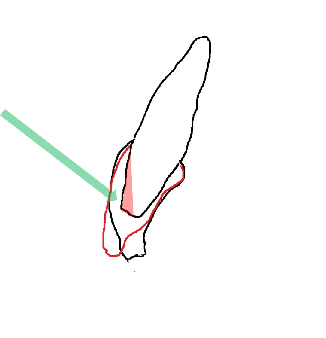 Je veux dire que le moignon, qu'il s'agisse d'un IC, d'une RCR ou d'une dent vivante, a été parfaitement préparé, mais que par dessus ça, le prothésiste a tiré tout droit (en rouge sur mon oeuvre d'art).