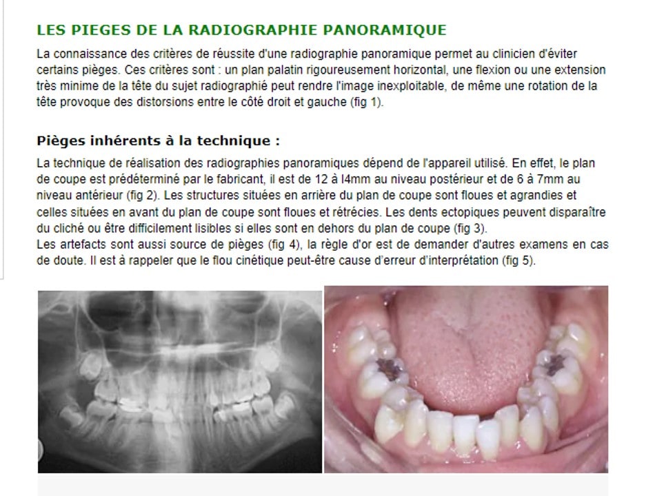 La technique de réalisation des radiographies panoramiques dépend de l'appareil utilisé. En effet, le plan de coupe est prédéterminé par le fabricant, il est de 12 à l4mm au niveau postérieur et de 6 à 7mm au niveau antérieur (fig 2). Les structures situées en arrière du plan de coupe sont floues et agrandies et celles situées en avant du plan de coupe sont floues et rétrécies. Les dents ectopiques peuvent disparaître du cliché ou être difficilement lisibles si elles sont en dehors du plan de coupe (fig 3).