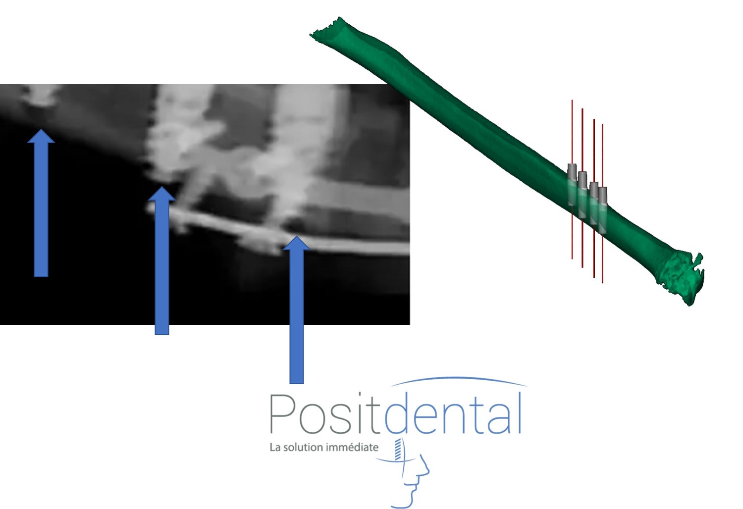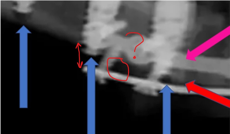 A 1 an je vois une cratérisation sur le vis distale et de l'os entre la vis distale et celle en mésial alors que la pano laisse penser que la plaque d'ostéosynthèse est dans le vide. Ceci est la résultante de la position de la tangente de la portion d'ellipse lors de la prise panoramique.