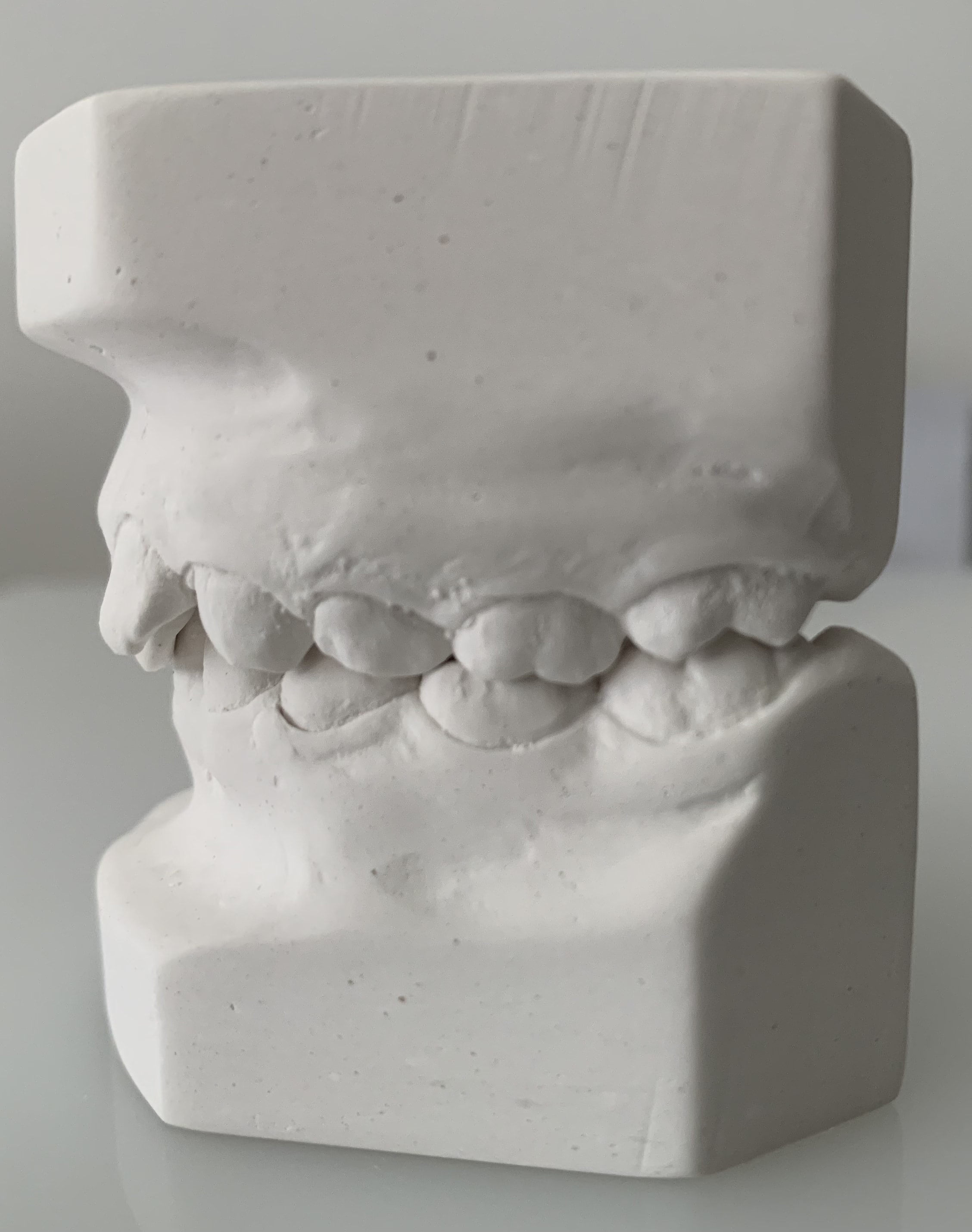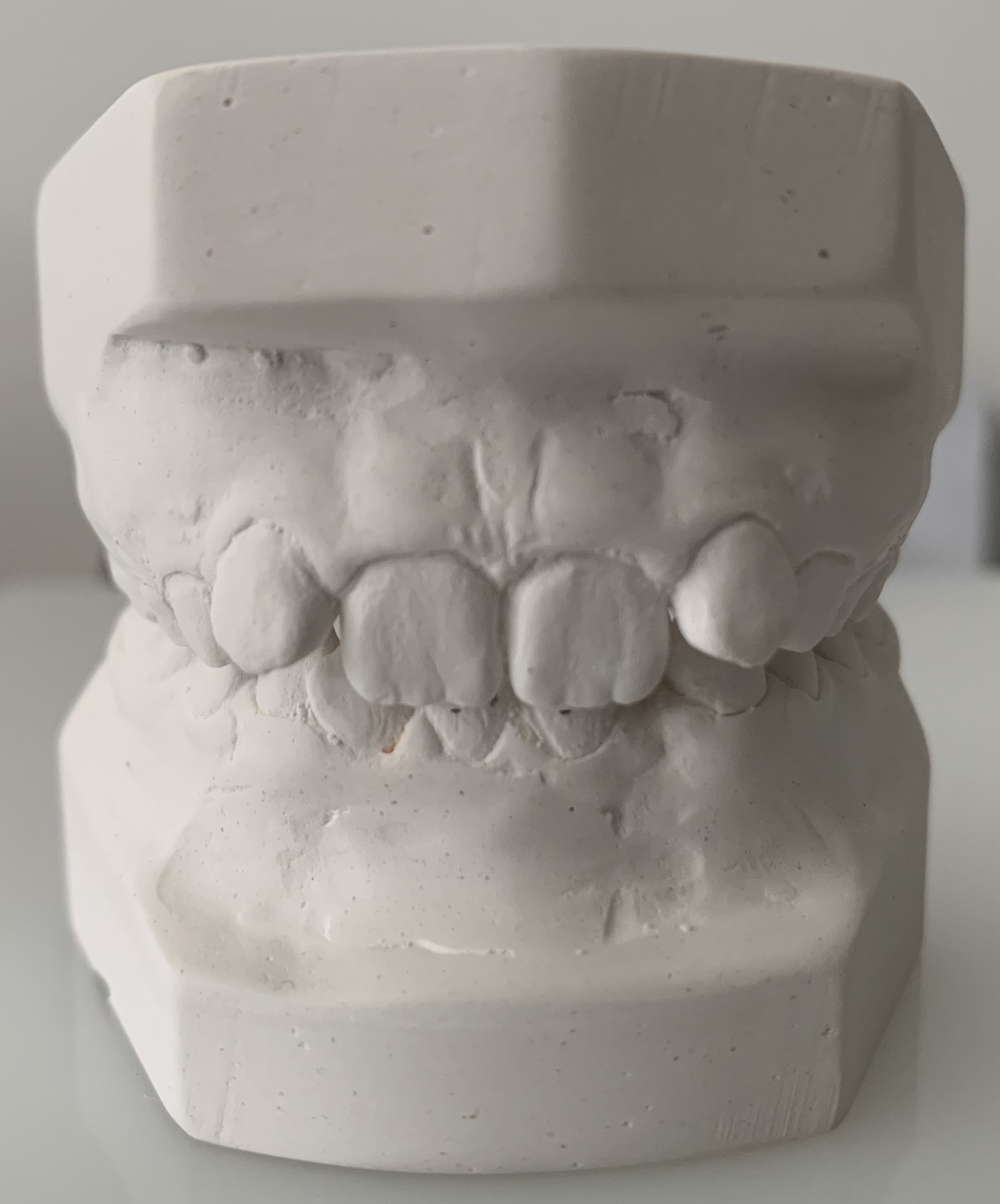 Pas d’inverse d’occlusion, distance 6-6 maxillaire = 35mm. Inclinaison coronolinguale des procès alvéolaires