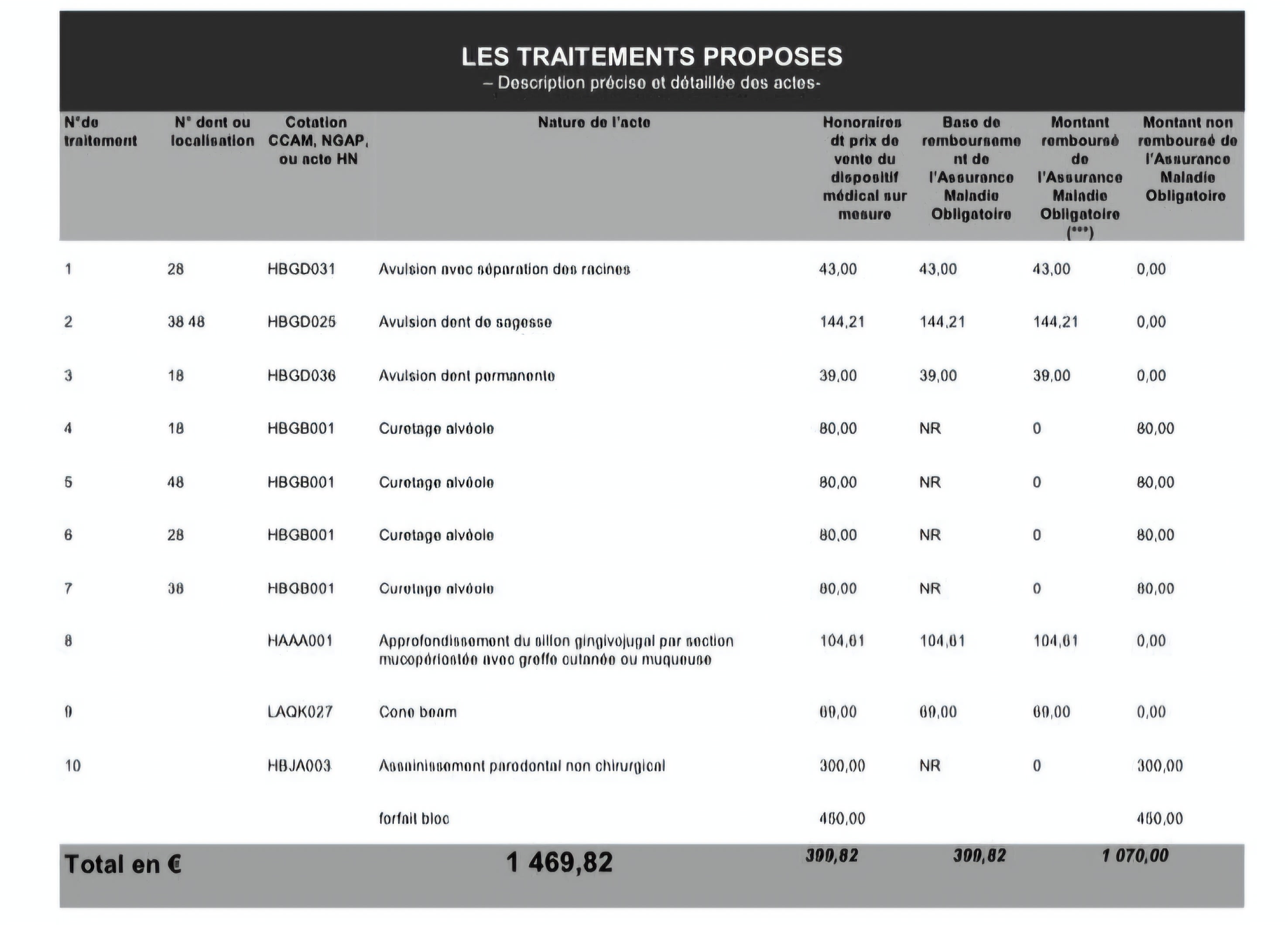 Petit devis reçu récemment, je vous laisse apprécier la variété des actes, histoire de multiplier les fraudes plutôt que de facturer un bloc à 800 balles (je précise qiue ce n'est pas pour de l'AG au passage, juste une avulsion des 4 dds en ambulatoire sans traitement paro) . Ca c'est pas bien, faut pas.