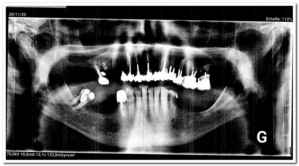 Et la bouche actuelle du patient est dégueu : 16 pas extraite, provisoire 32 tombée, les dents manquantes non remplacées sur le stelite mandibulaire. Rien n'est proposé pour la 27.