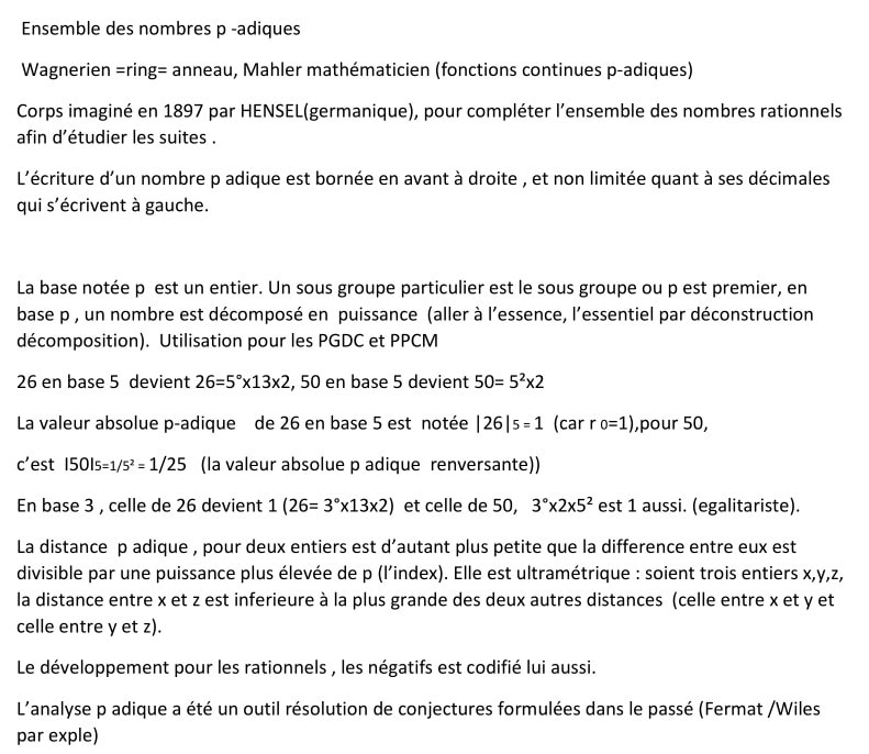 On rappelle qu'il existe un prix de 5M de dollars pour celui oucelle qui trouvera l'algoritme parfait des nombres premiers, avec l'effondrement immédiat du systeme bancaire dematerialisé et des crypto monnaies si c'est découvert...Un partie de la formule des crypto monnaies avec une formule longue de plusieurs metres, fait intervenir ces nombres p_adiques, donc les nombres premiers.....